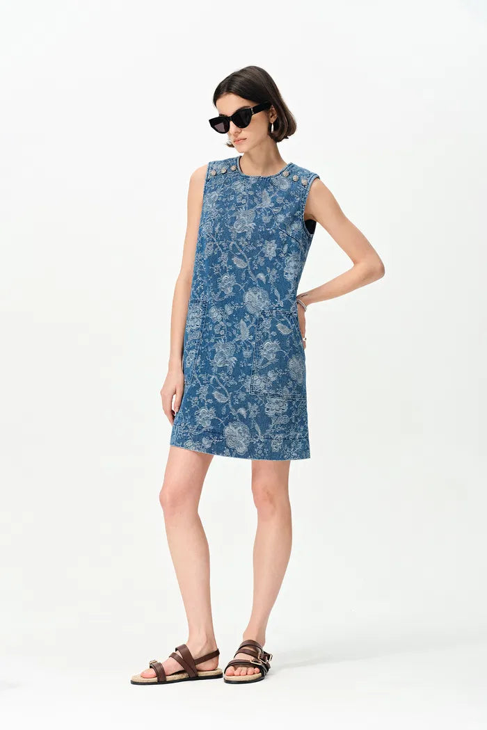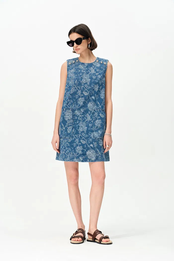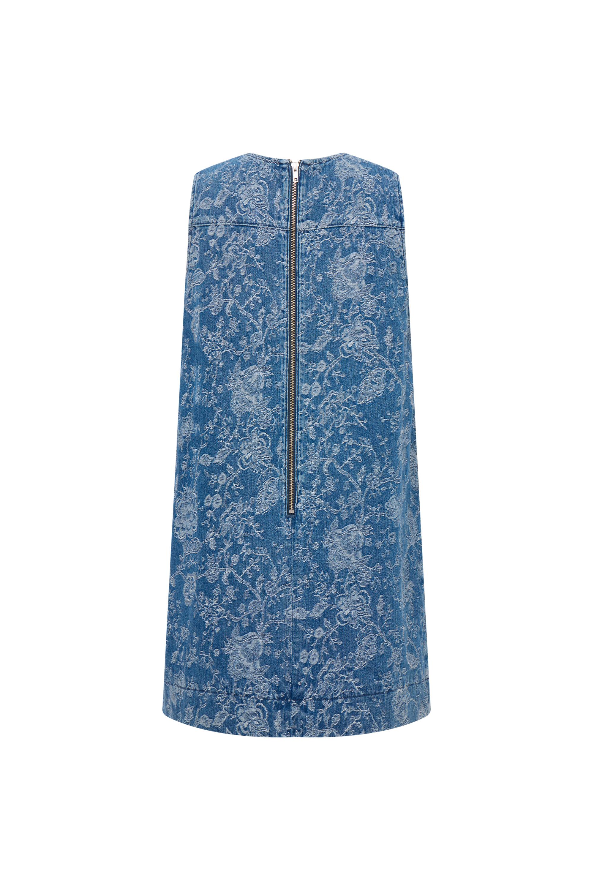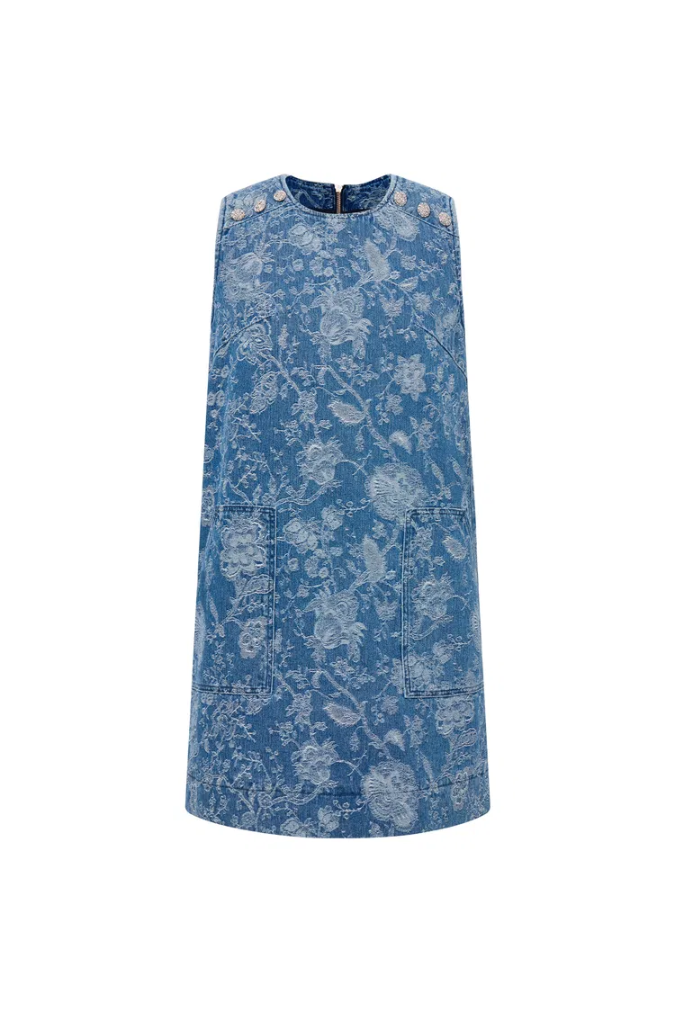 Iris Flora Laserwork Round Neck Short Dress in Cotton Denim