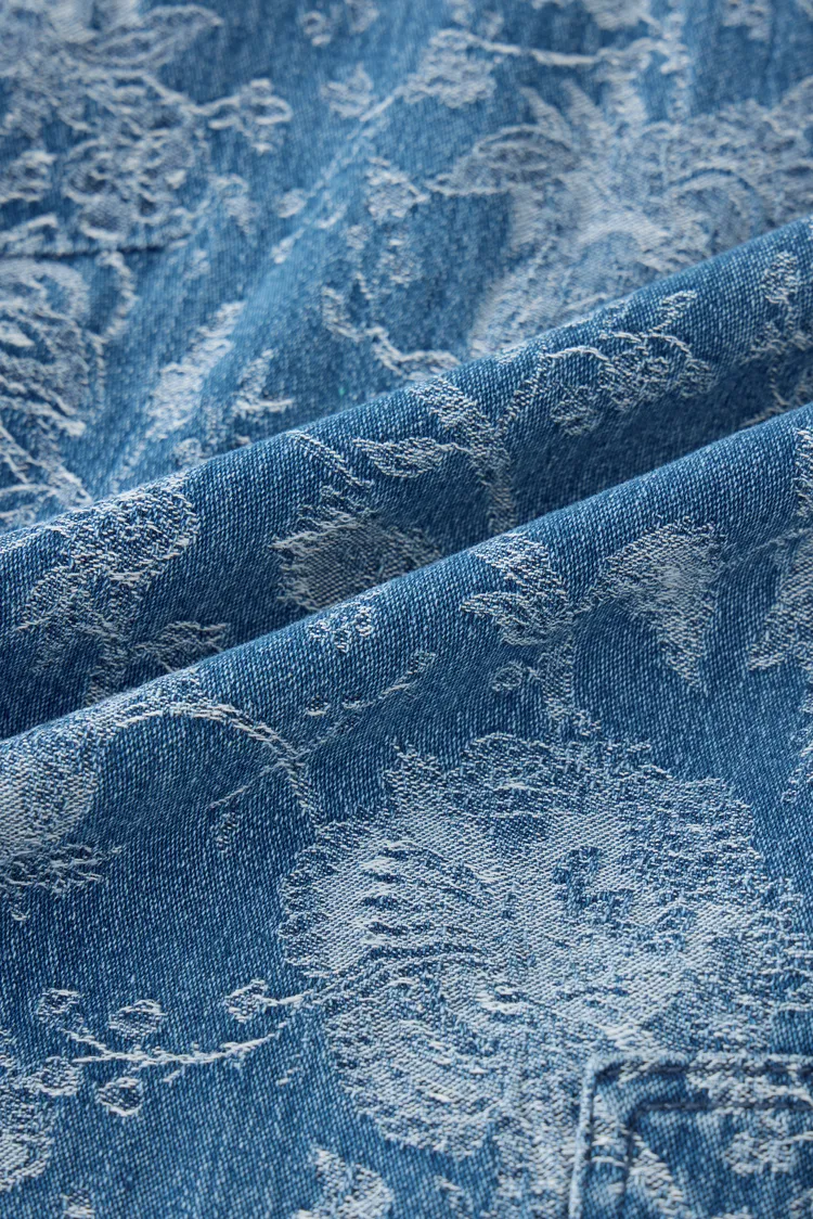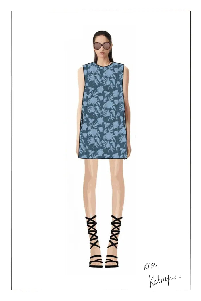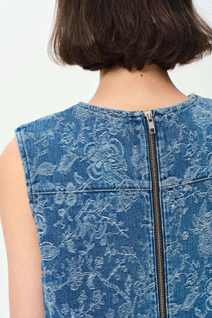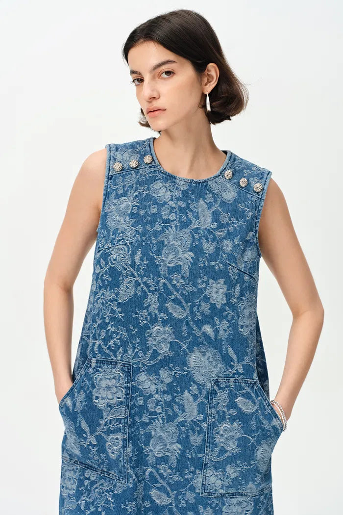 Iris Flora Laserwork Round Neck Short Dress in Cotton Denim
