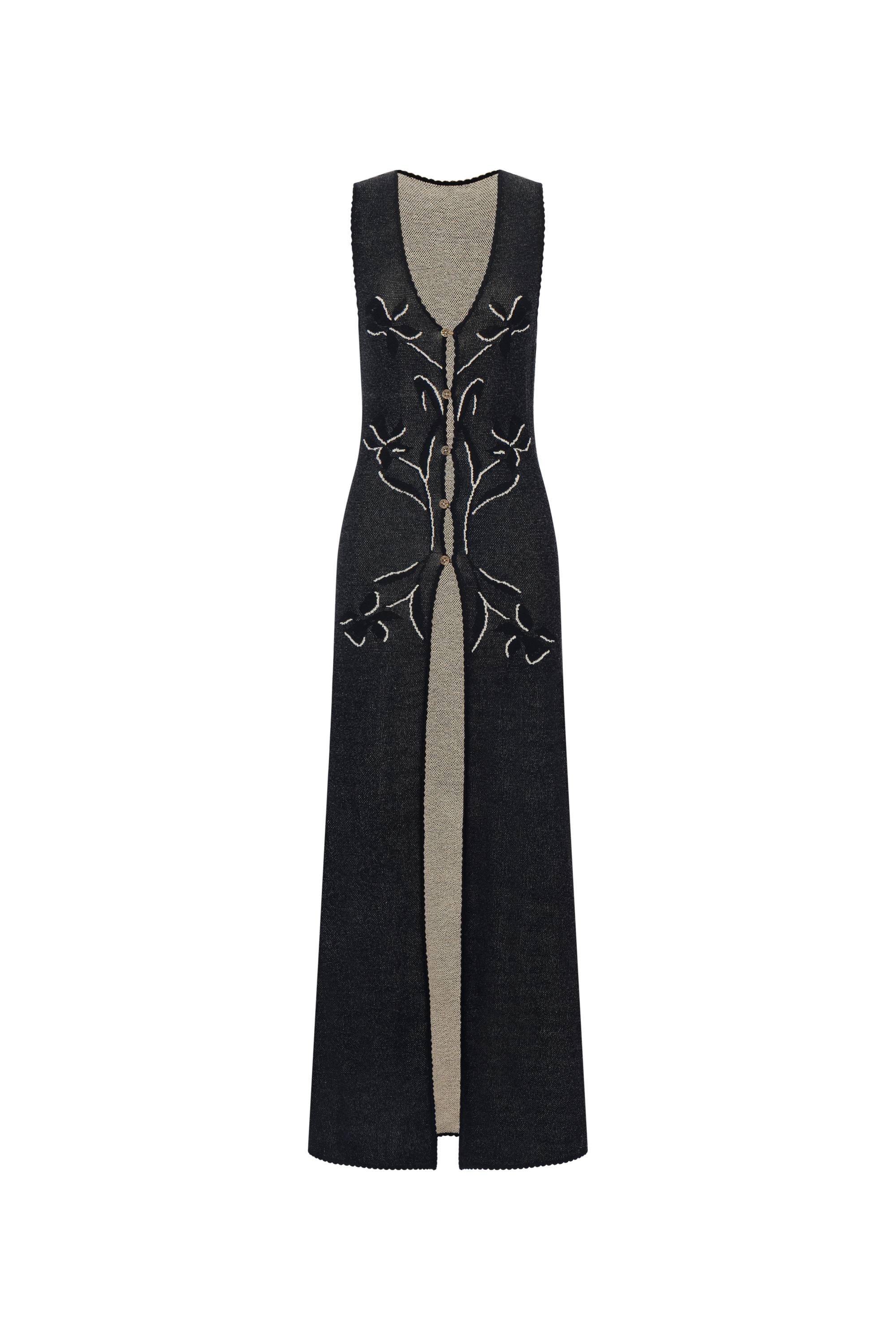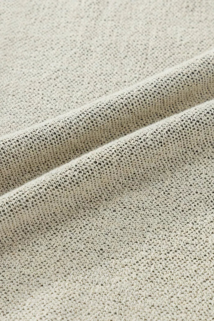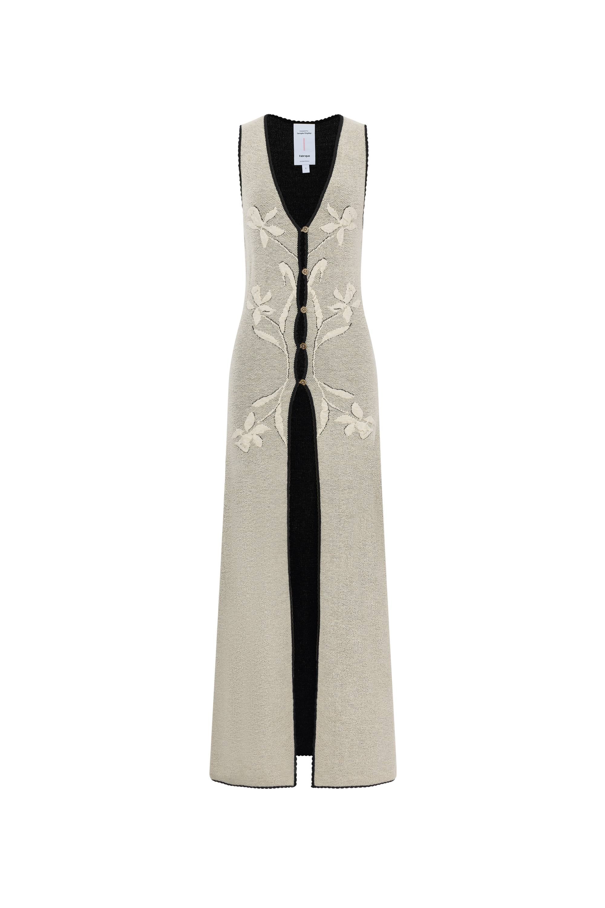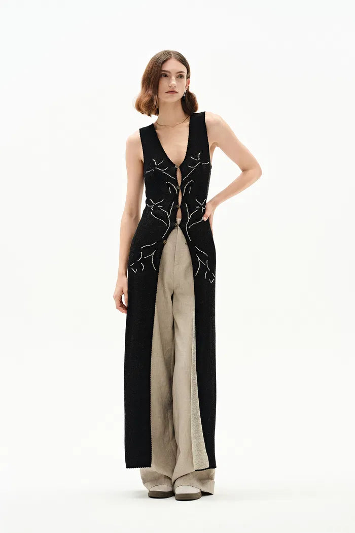 Think of this as your knit's elegant evolution. The split V-front cascades into a flowing side, while iris patterns add artisanal depth. Reversible in cream and noir, it transforms basics into statements. Perfect for those moments when a regular vest feels too expected.