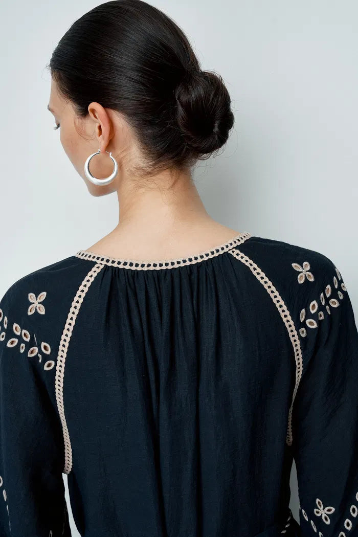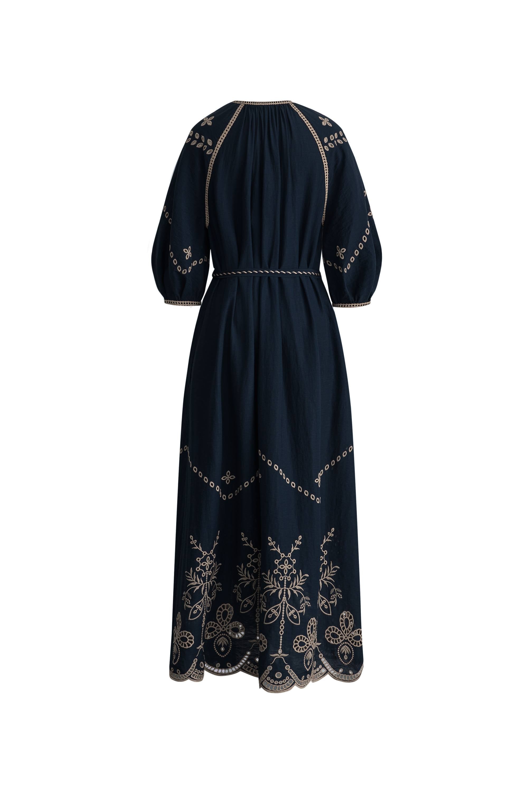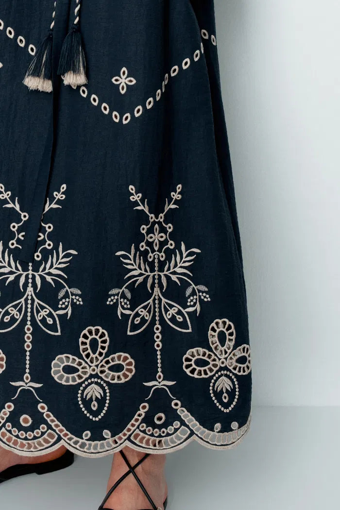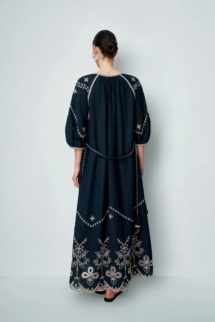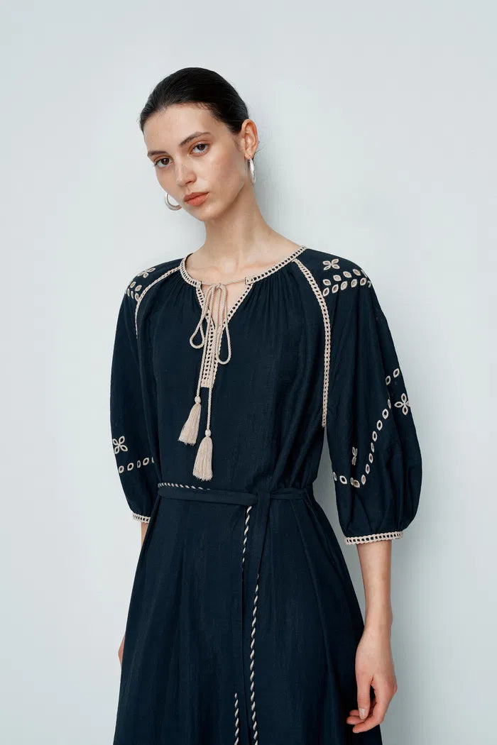 A navy background and contrasting embroidery transform this robe dress into something special. Raglan bubble sleeves balance the fluid silhouette, while dual belts with tassels define the waist beautifully. In breathable linen, it's light enough for the hottest days while keeping its structure.