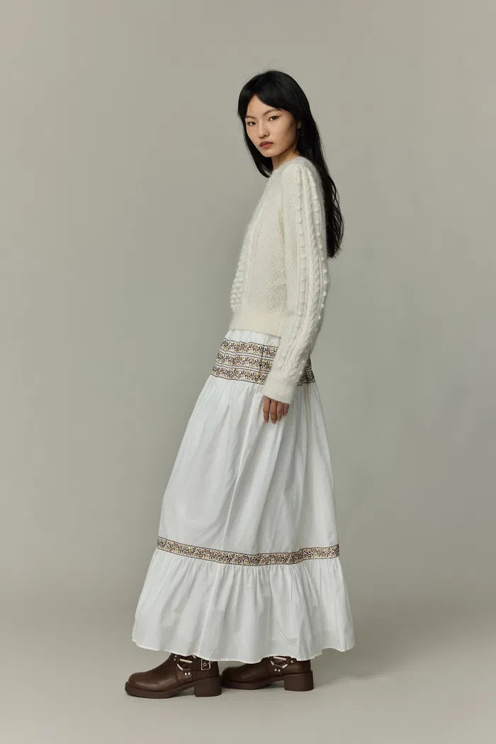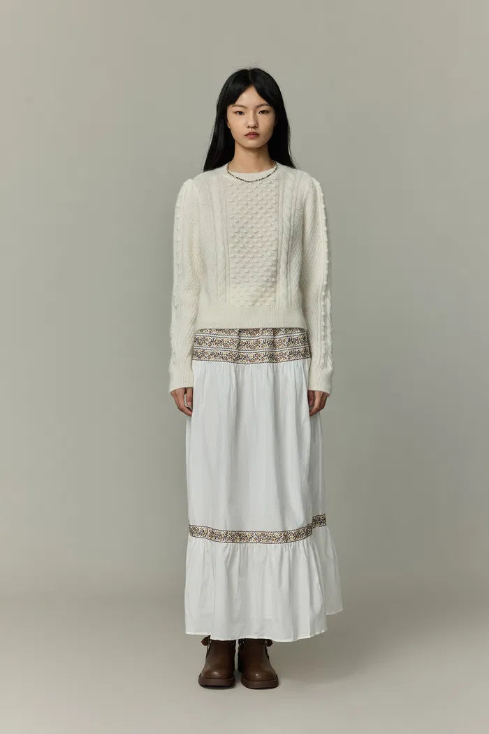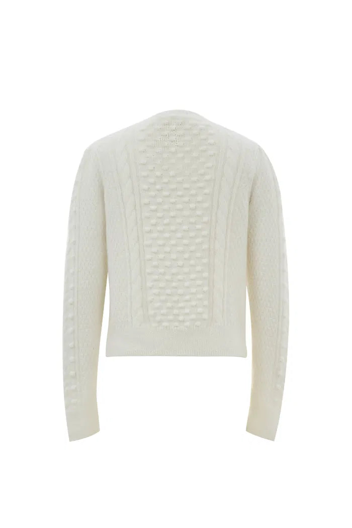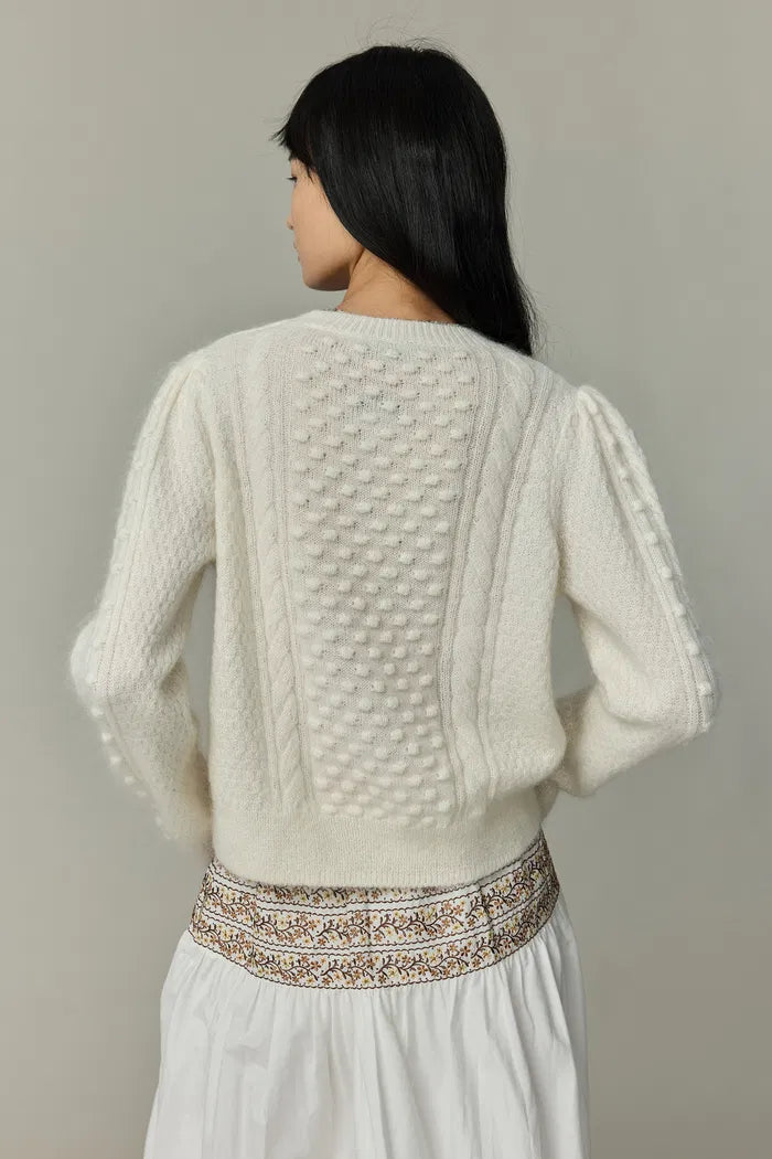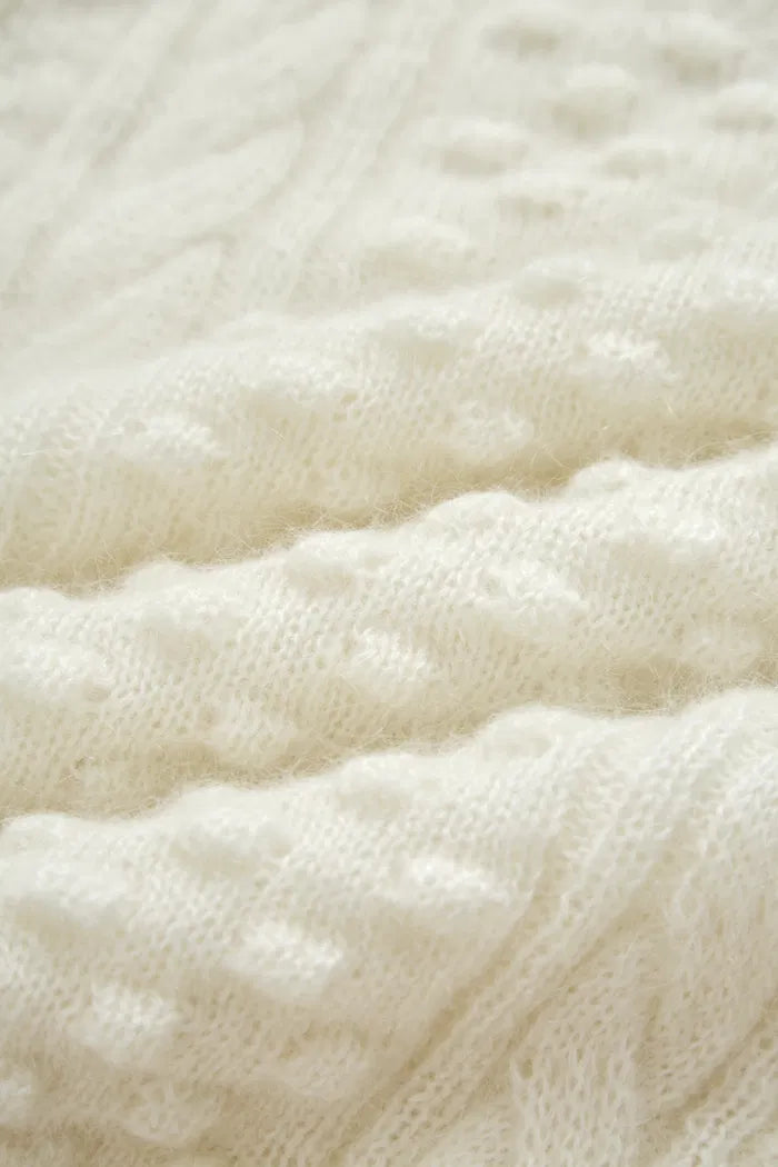 Wrap yourself in a cloud of vintage-inspired elegance. This sweater's intricate cable knit, dotted with pearls, meets airy mohair for a fresh take on cozy. With its round neck and subtle puff sleeves, it's your new favorite for both coffee dates and gallery nights.