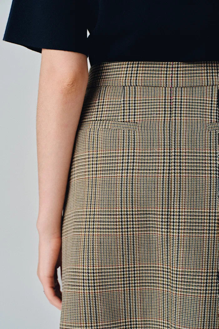 Welsh plaid tells a new story in this pleated skirt. Traditional patterns meet precise pleating, creating movement without bulk. Anti -wrinkle Merino wool adds warmth to heritage style.
