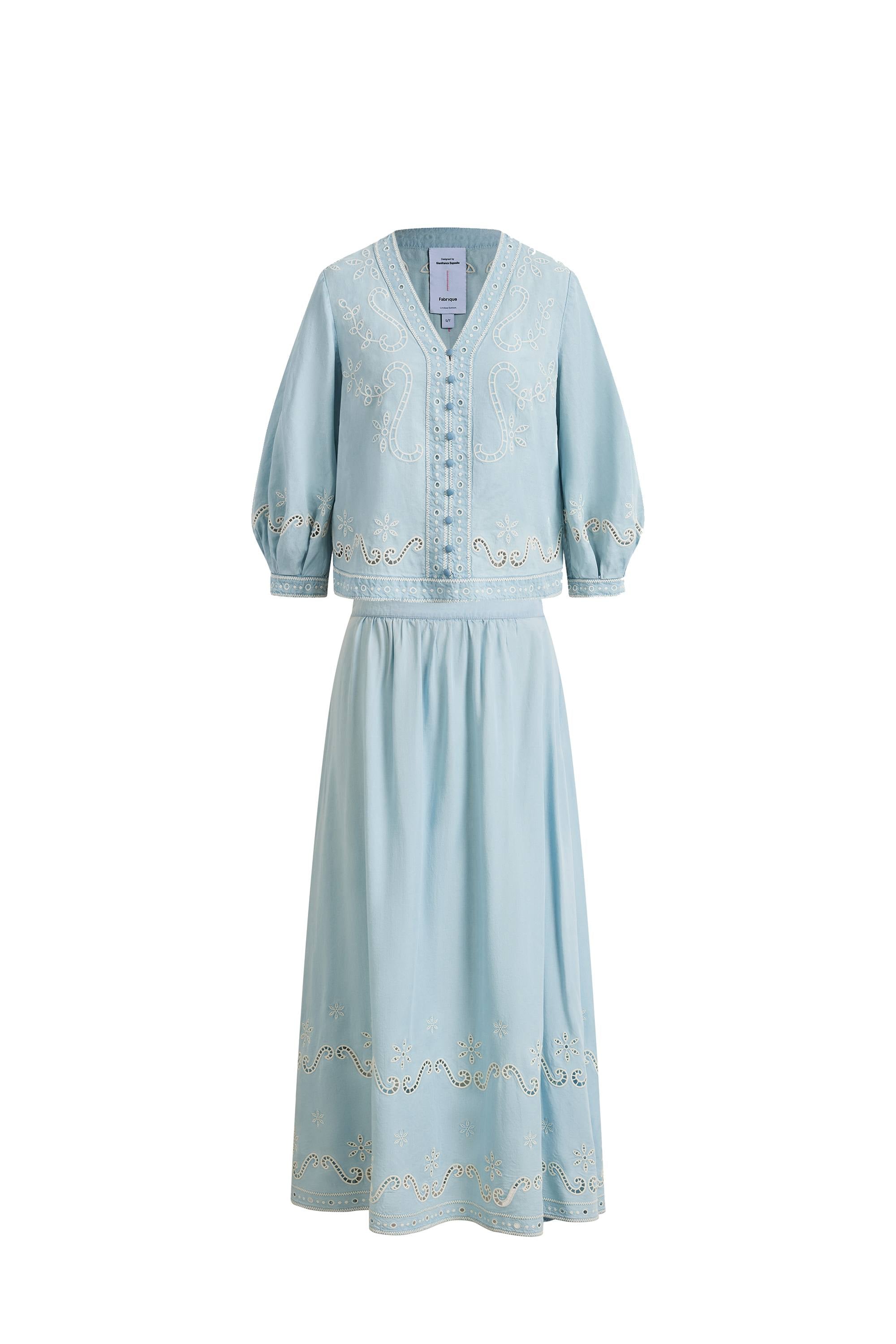 Marmont Pin Tuck Embroidery Blouse and Skirt Matching Set in Tencel Denim