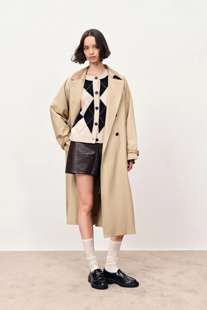 Offset diamond pattern creates deconstructed appeal while ginger thread details add visual interest to neutral blocks. Pure wool construction provides warmth while short length works perfectly with contemporary high-waisted silhouettes.