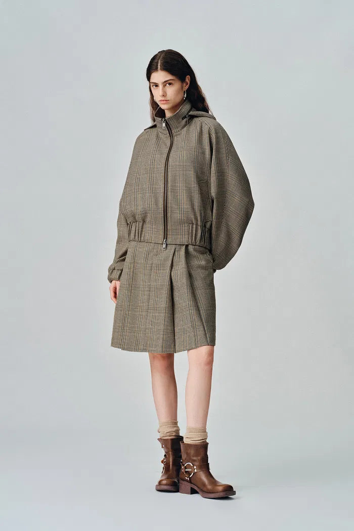 Heritage gets clever in this Welsh plaid jacket. A hidden hood zips into the stand collar – practicality with polish. Bronzed hardware adds just enough edge to tradition.
