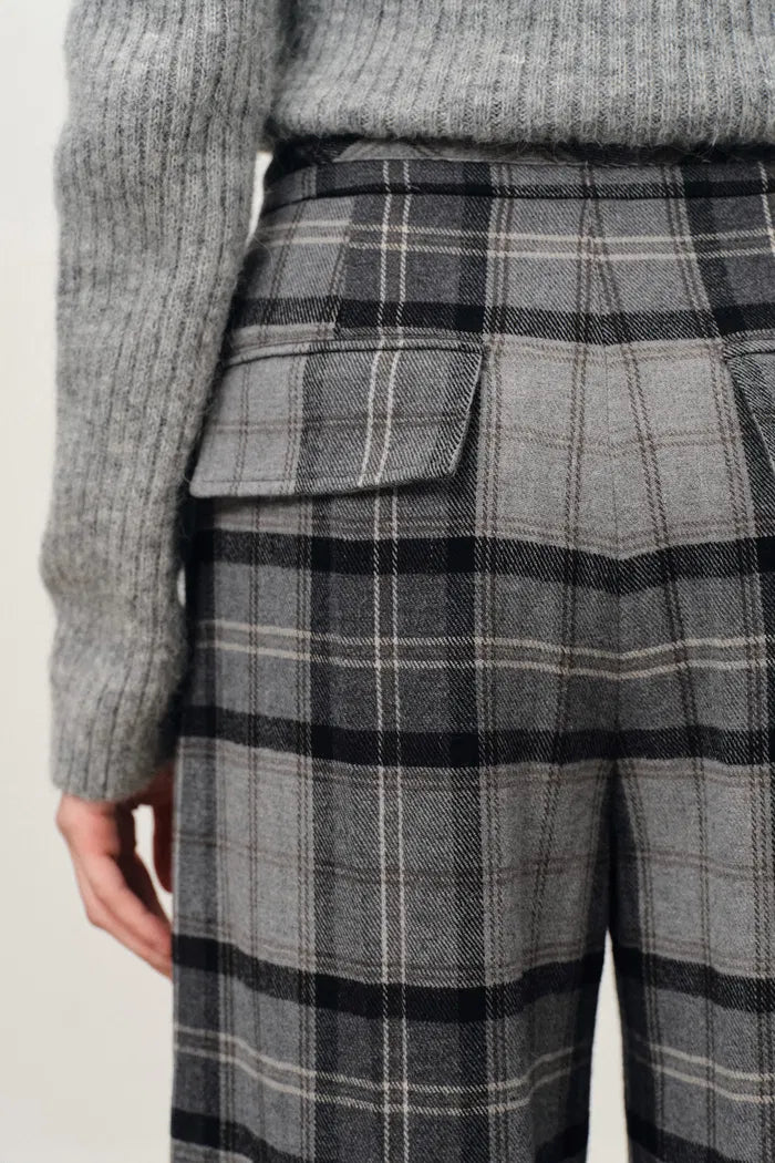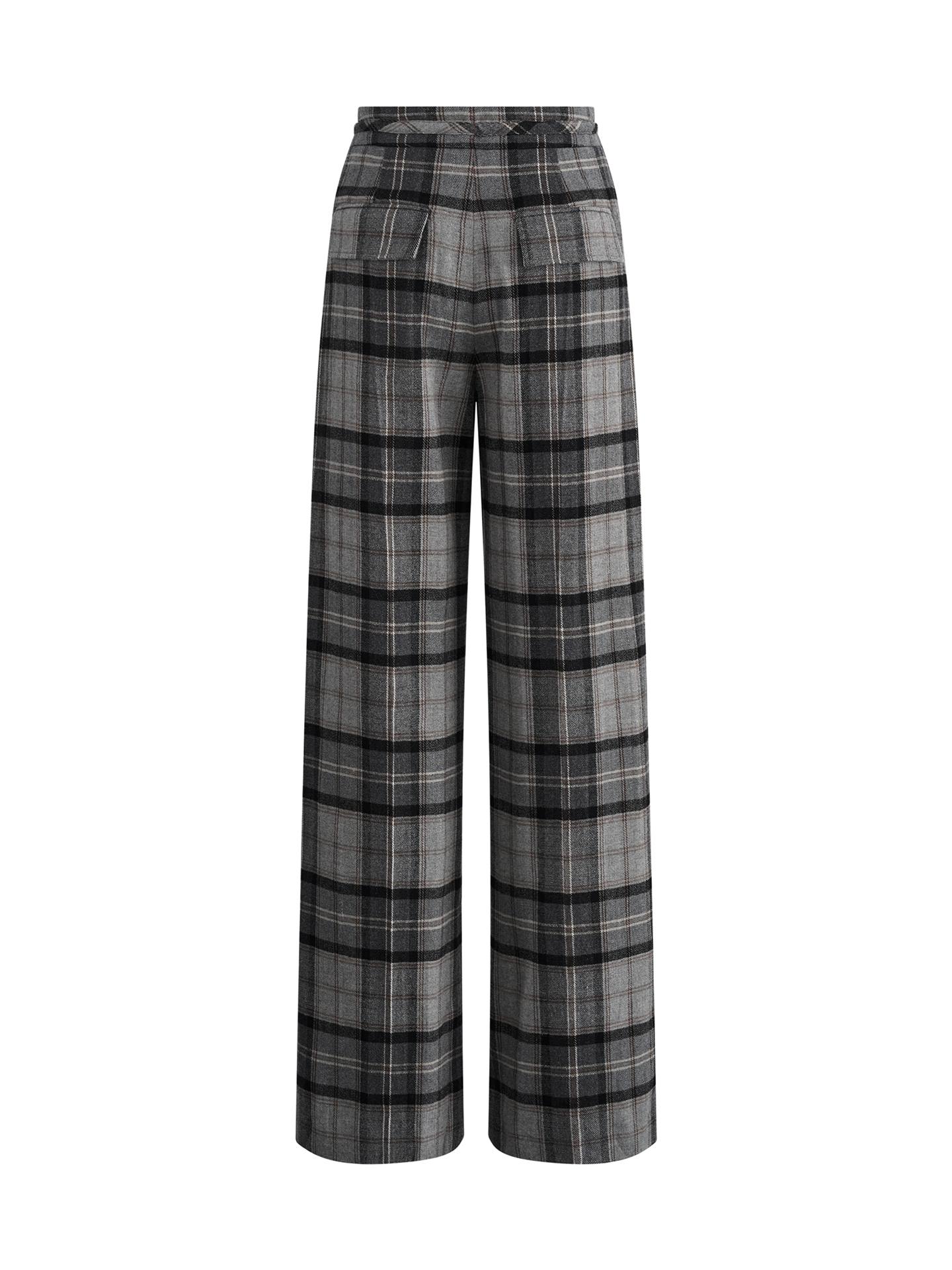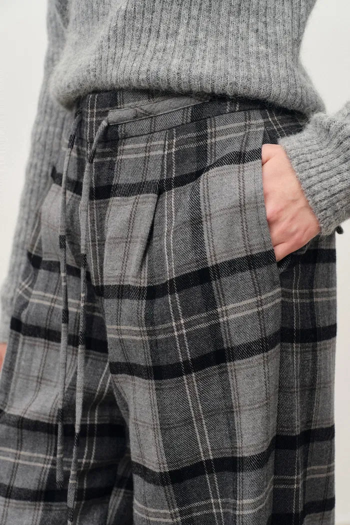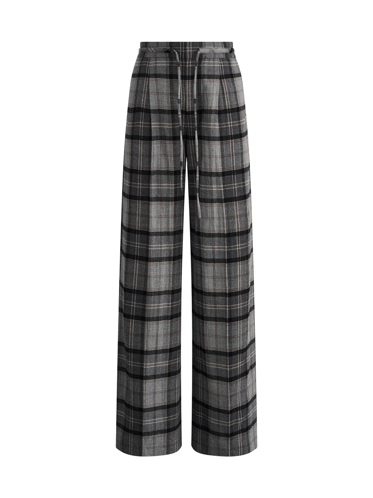 Drawstring waist provides adjustable comfort while brushed wool surface adds tactile appeal. Classic wide-leg proportions create relaxed elegance while grey plaid maintains sophisticated versatility.