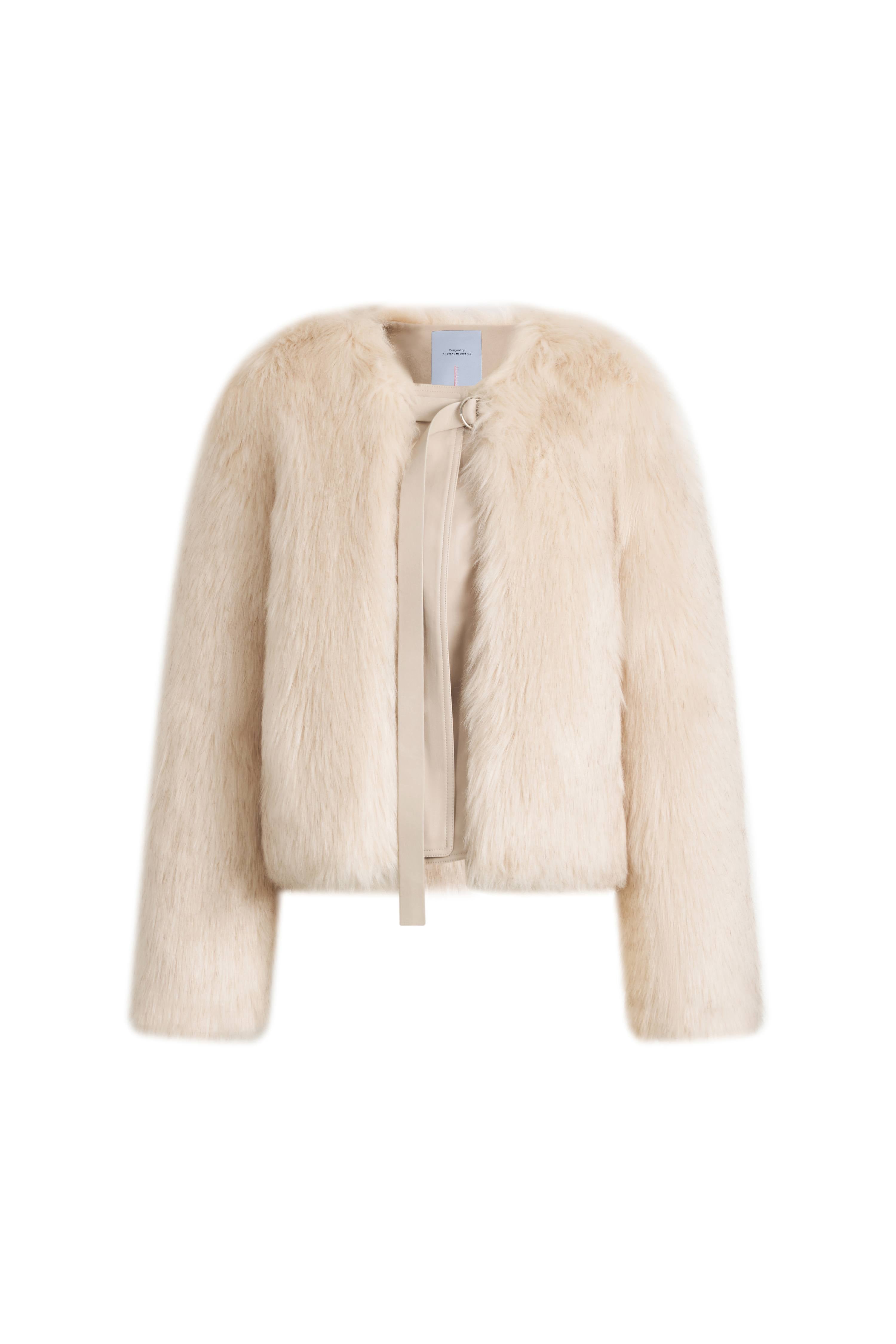 The kind of faux fur that actually moves with you. Long brushed fibers create natural dimension, anchored by clean leather toggles that keep it modern.