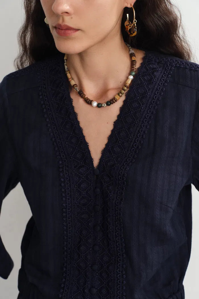 - Lace-trimmed neckline