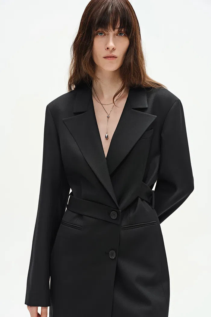 A clever hybrid in acetate-merino blend. Switch between a blazer dress or an outwerwear whenever you like. Sharp shoulders meet asymmetric belting for a dress that moonlights as a power blazer.