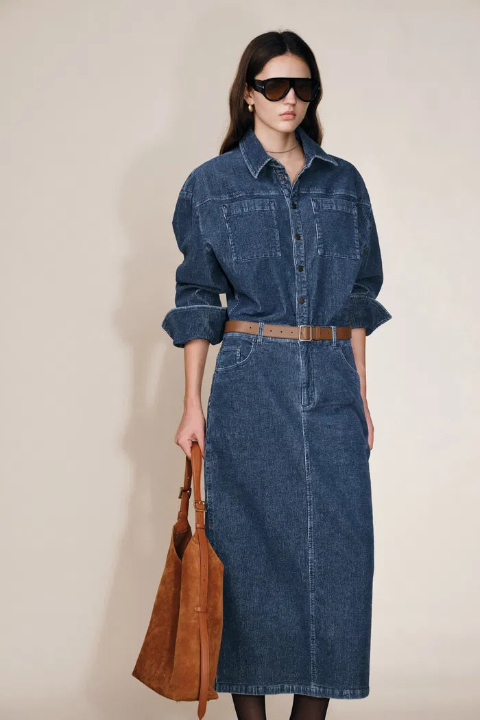 Quinn Antique Style Metal Buttons Dress in Washed Stretchy Corduroy