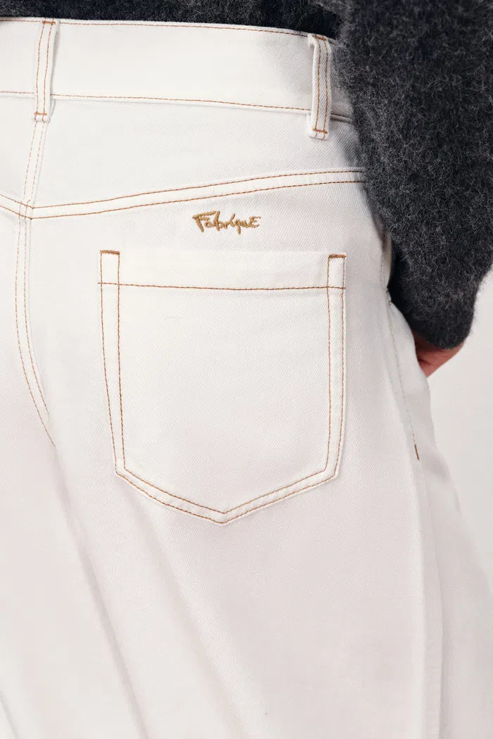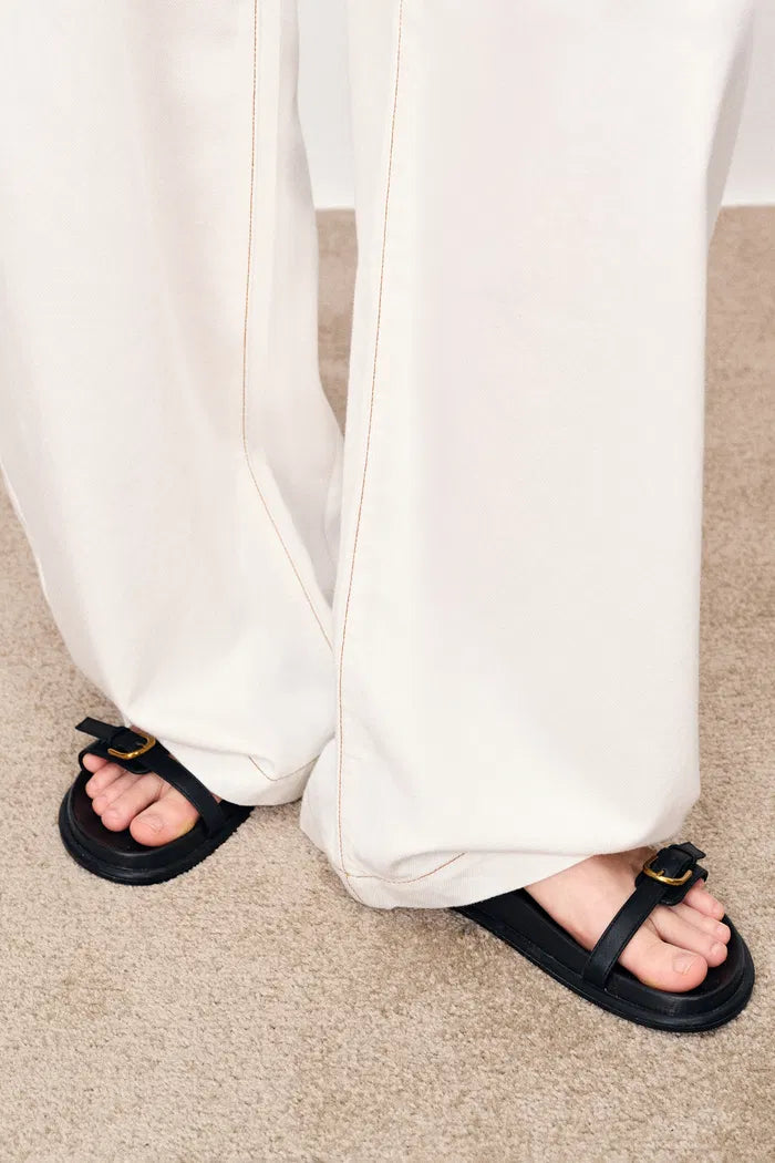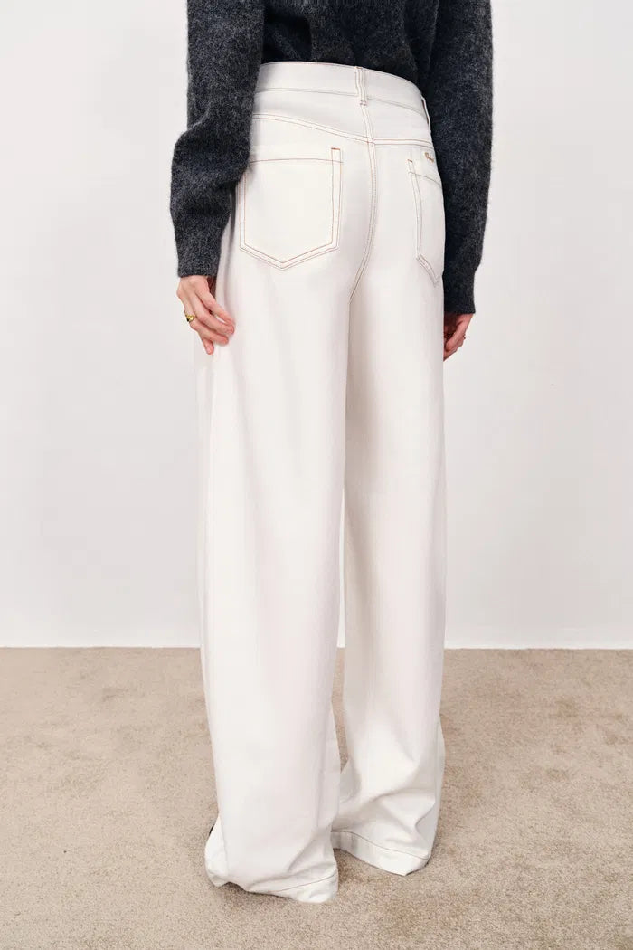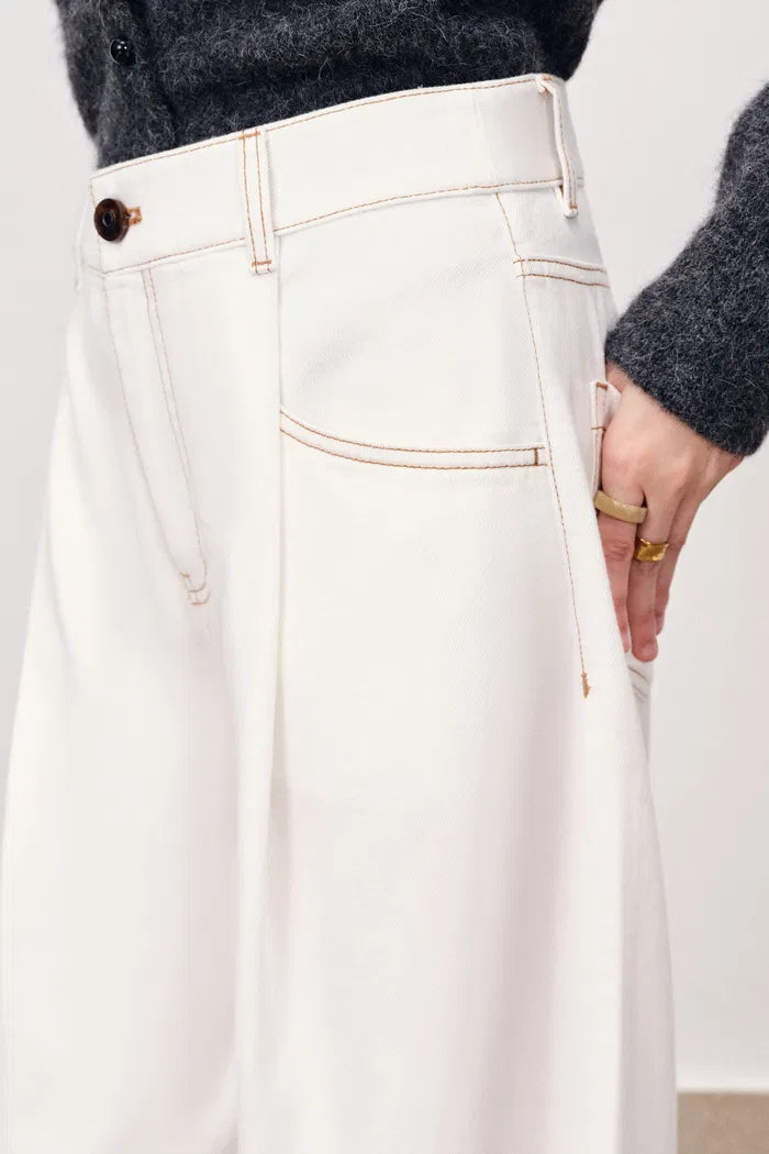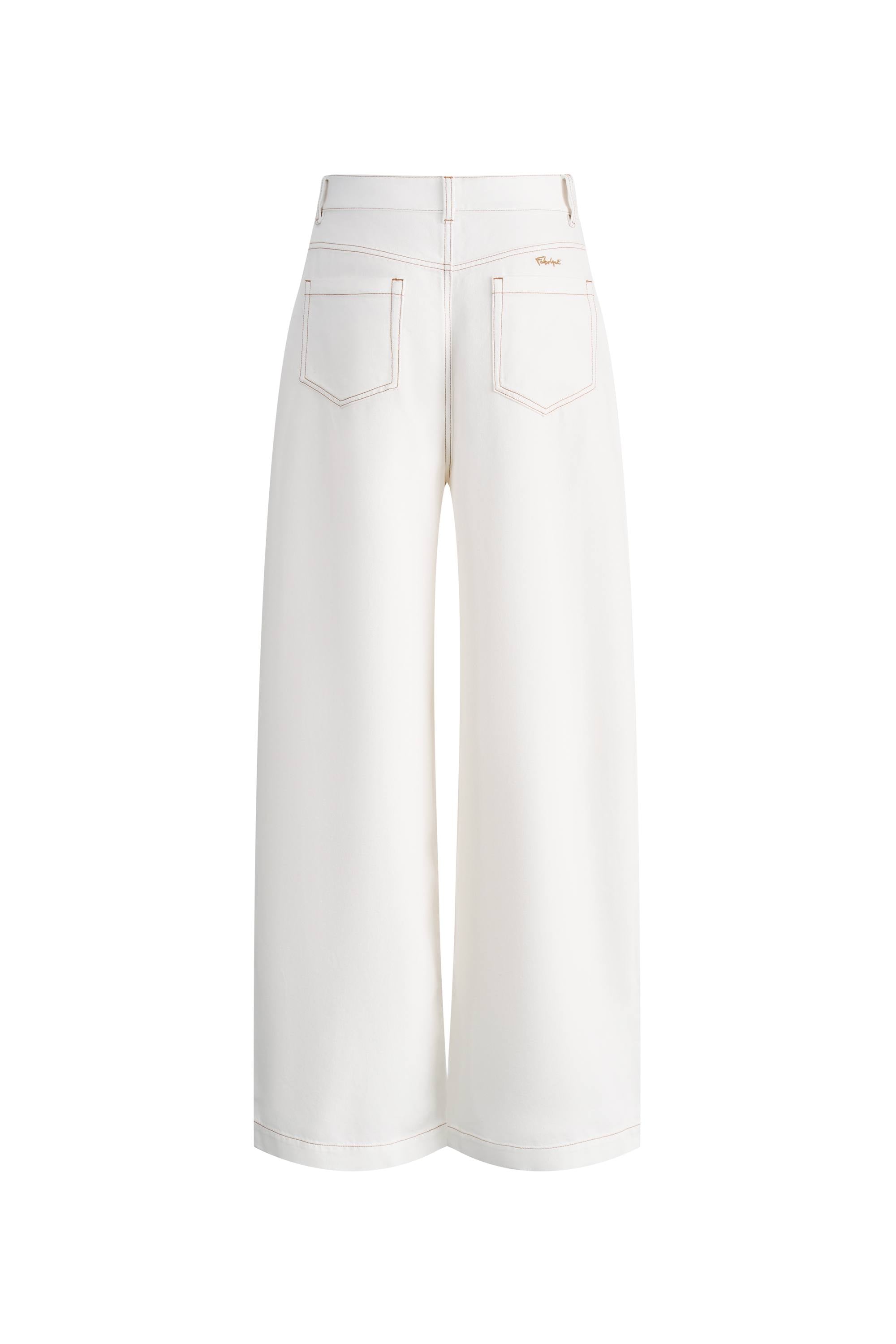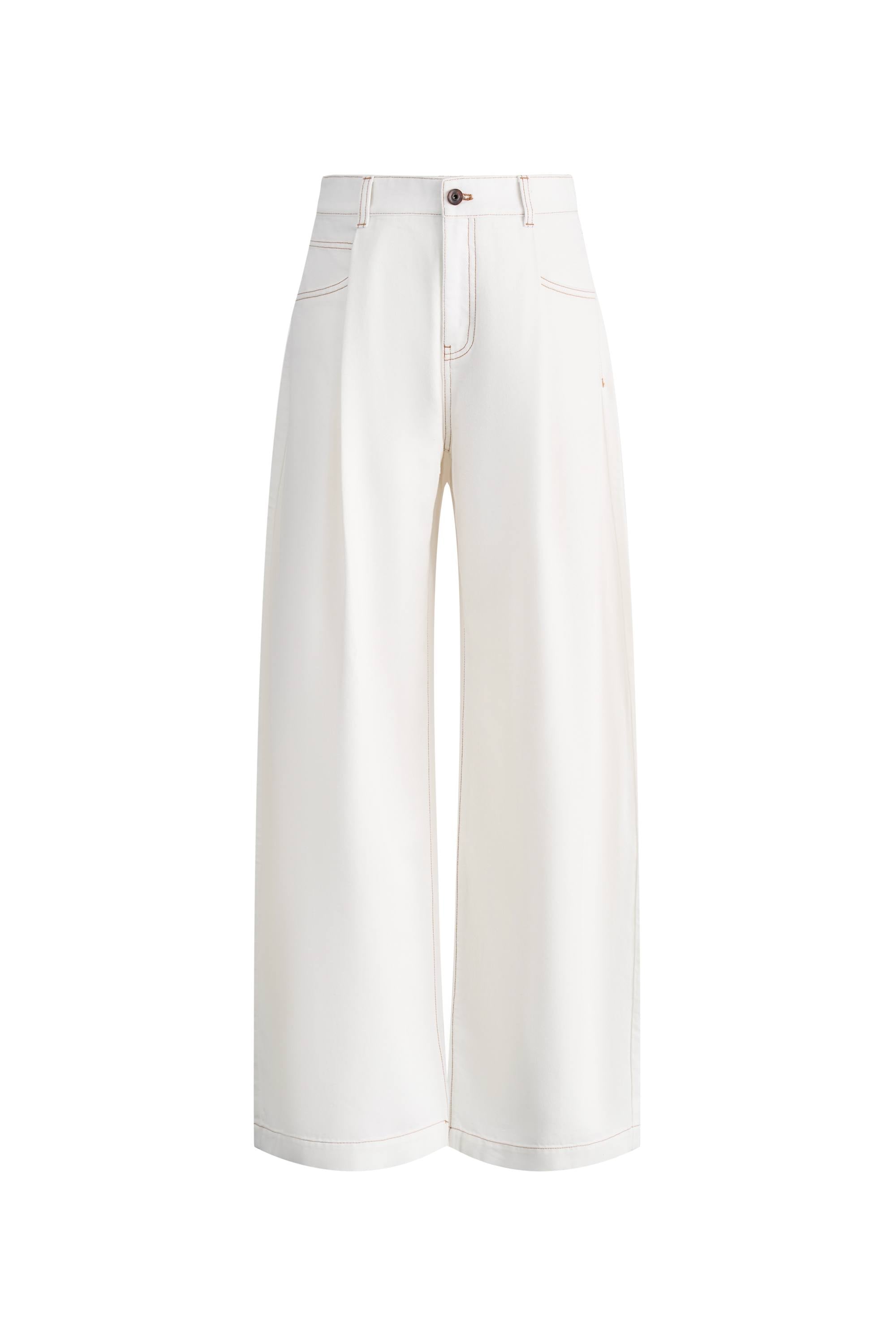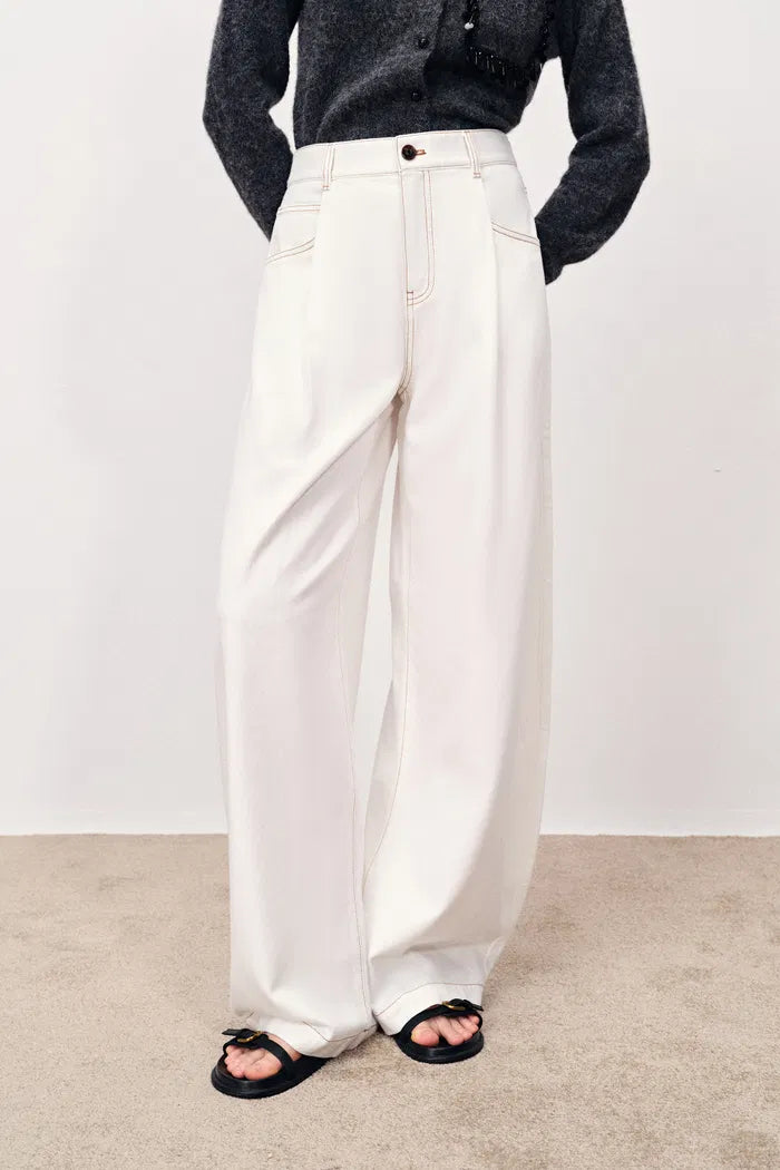 - Curved wide-leg silhouette