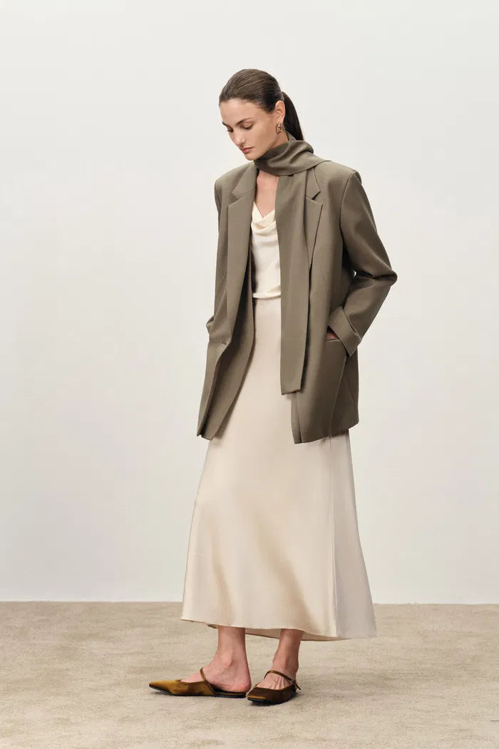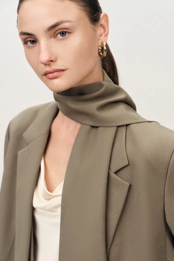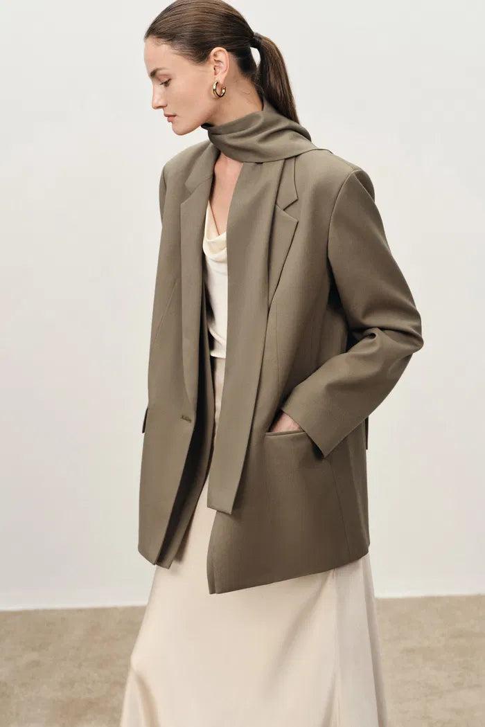 This blazer softens power suiting through relaxed proportions and layered front construction that creates visual interest. The matching scarf adds French styling versatility while grey suiting fabric coordinates seamlessly with existing professional wardrobes.
