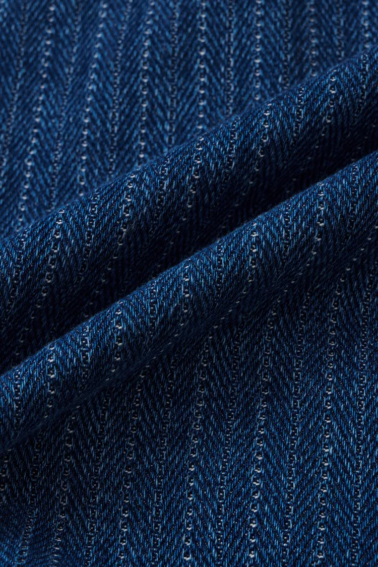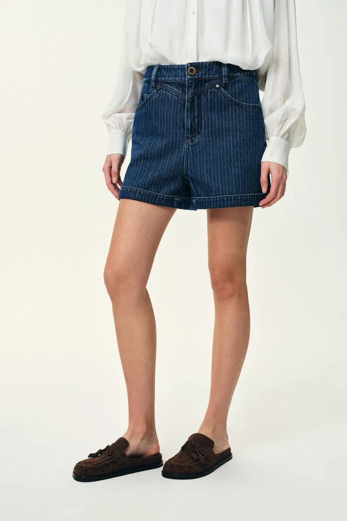 Colette Striped Washed Blue Patch Pocket Jacket and Shorts in Herringbone Denim