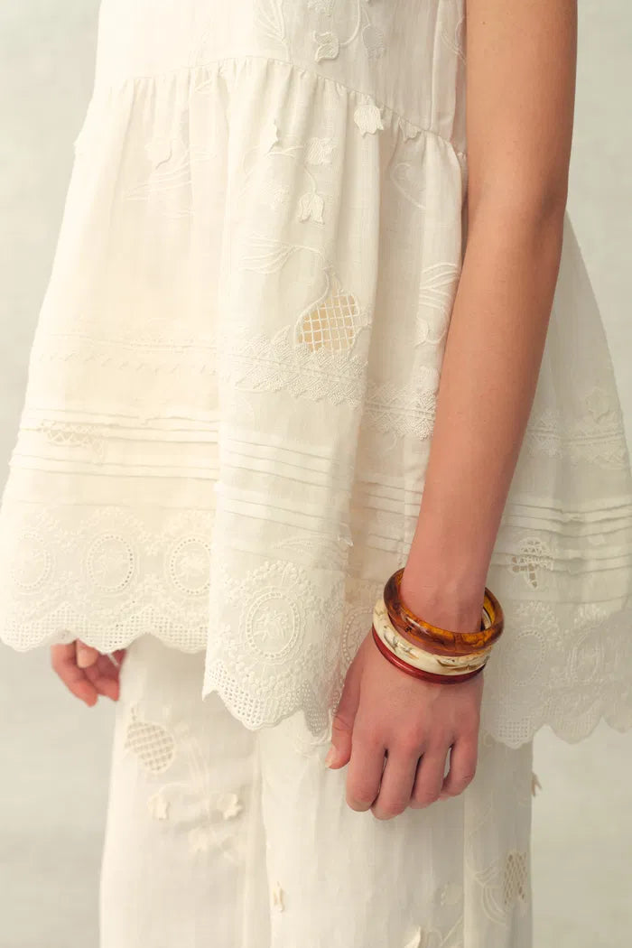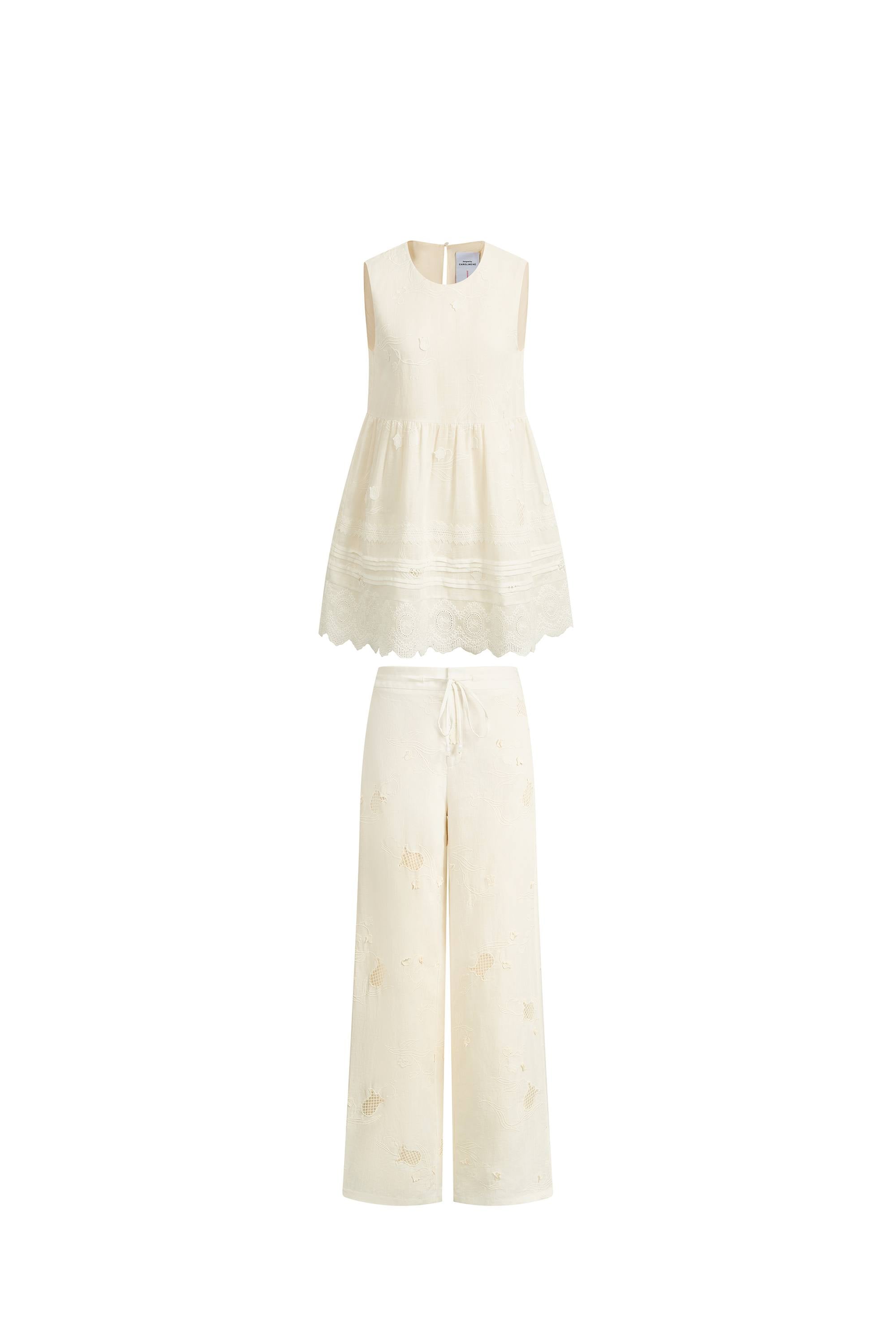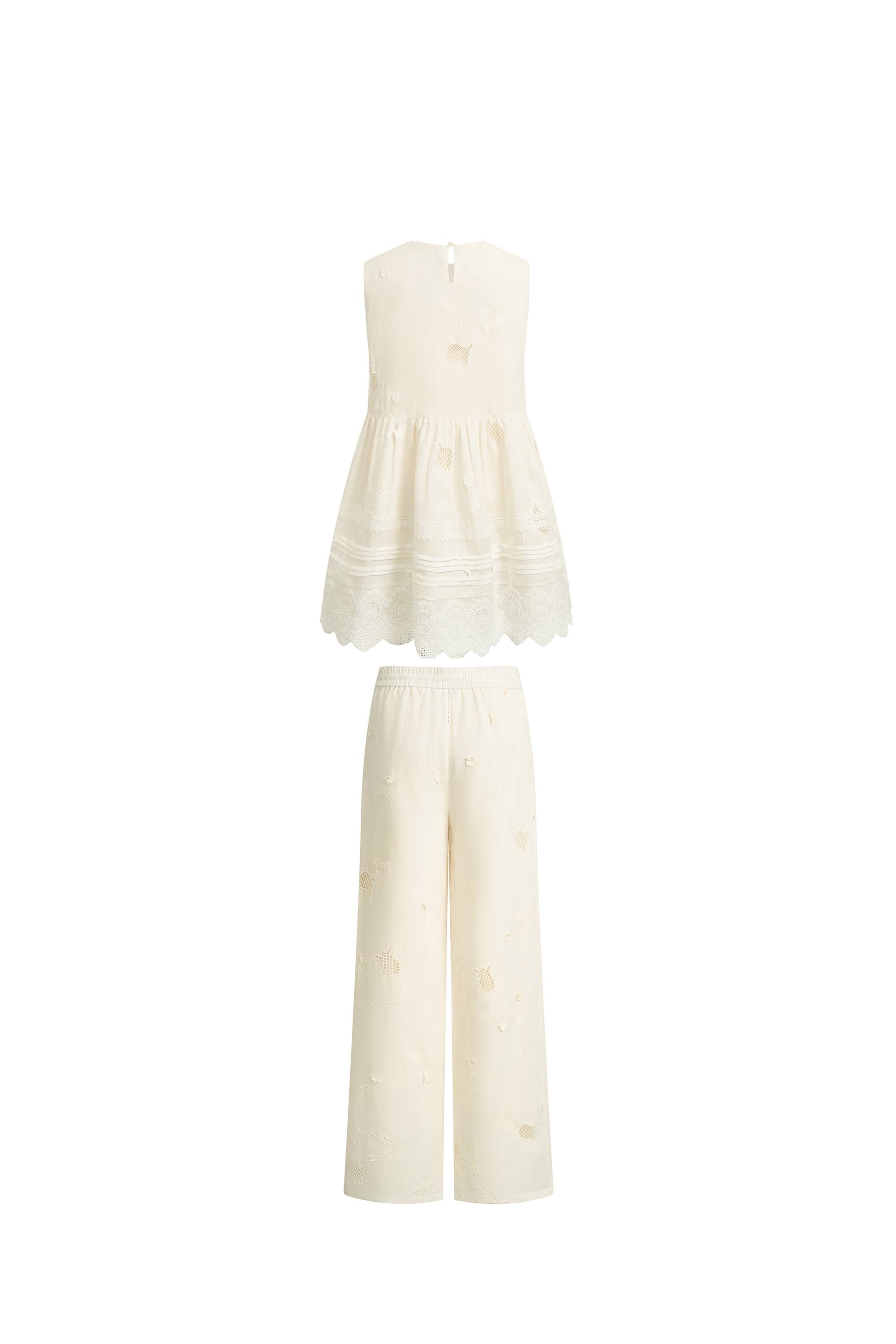 Doris Lily-of-the-Valley Lace Sleeveless Top and Pants Matching Set in Silk Linen Blend