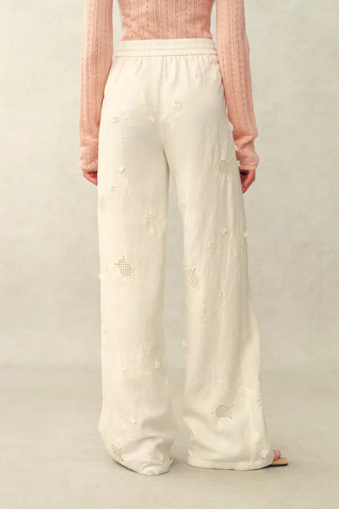 Hollowed embroidery and lace ribbons bring together modern tailoring and a light, ethereal mood. The graceful shape and skin-friendly lining keep it comfortable while still feeling polished. Hollowed-out embroidery brings in a lily-of-the-valley motif with a soft, sunlit mood. The flax texture adds natural character, while the mid-high waist and drawstring straps keep it comfortable. The silk-linen blend stays light, breathable, and easy to wear.