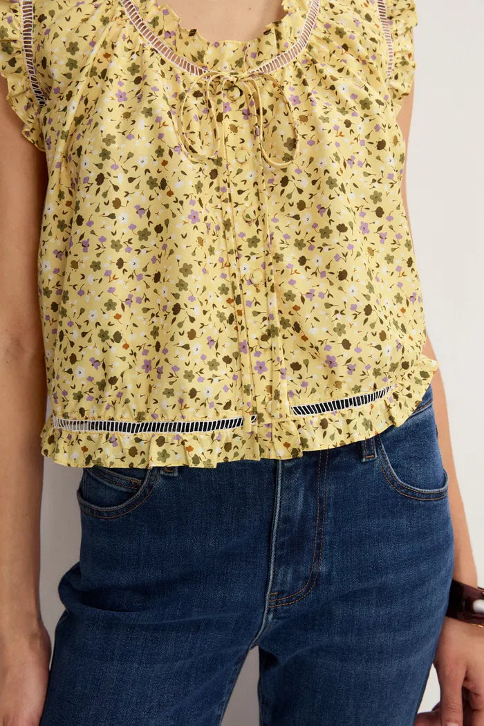 Think of this silk-cotton blouse as your sunny day essential. Delicate pleating meets eyelet trim for texture, while a tie neckline lets you adjust the look. In vibrant lemon yellow, it's the energy boost your wardrobe needs.