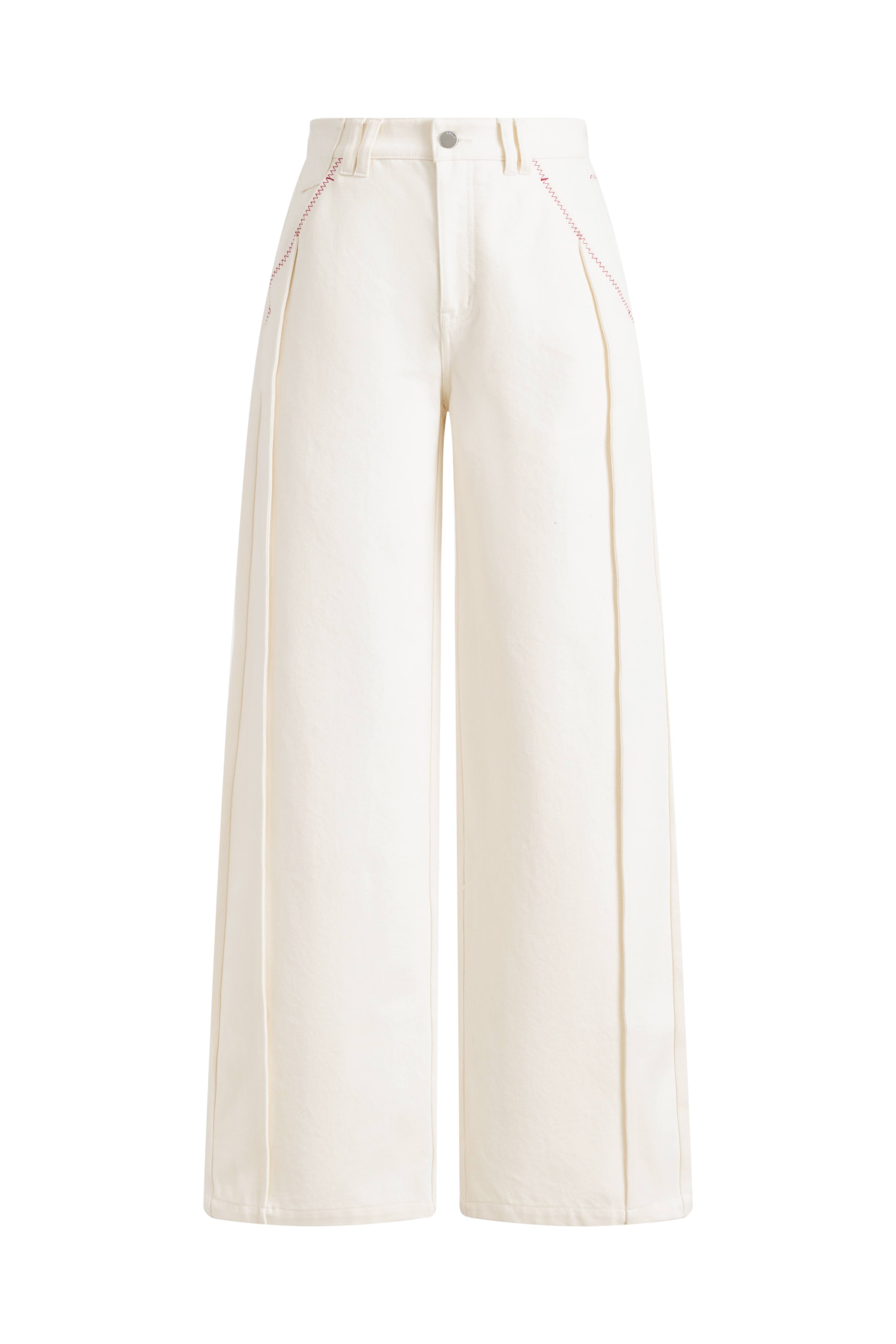 Milk-white wide-leg jeans with a curved cut and contrast Z-stitch detailing that reads subtle but distinctive. Lightweight cotton denim keeps the shape comfortable, especially in warmer seasons.
