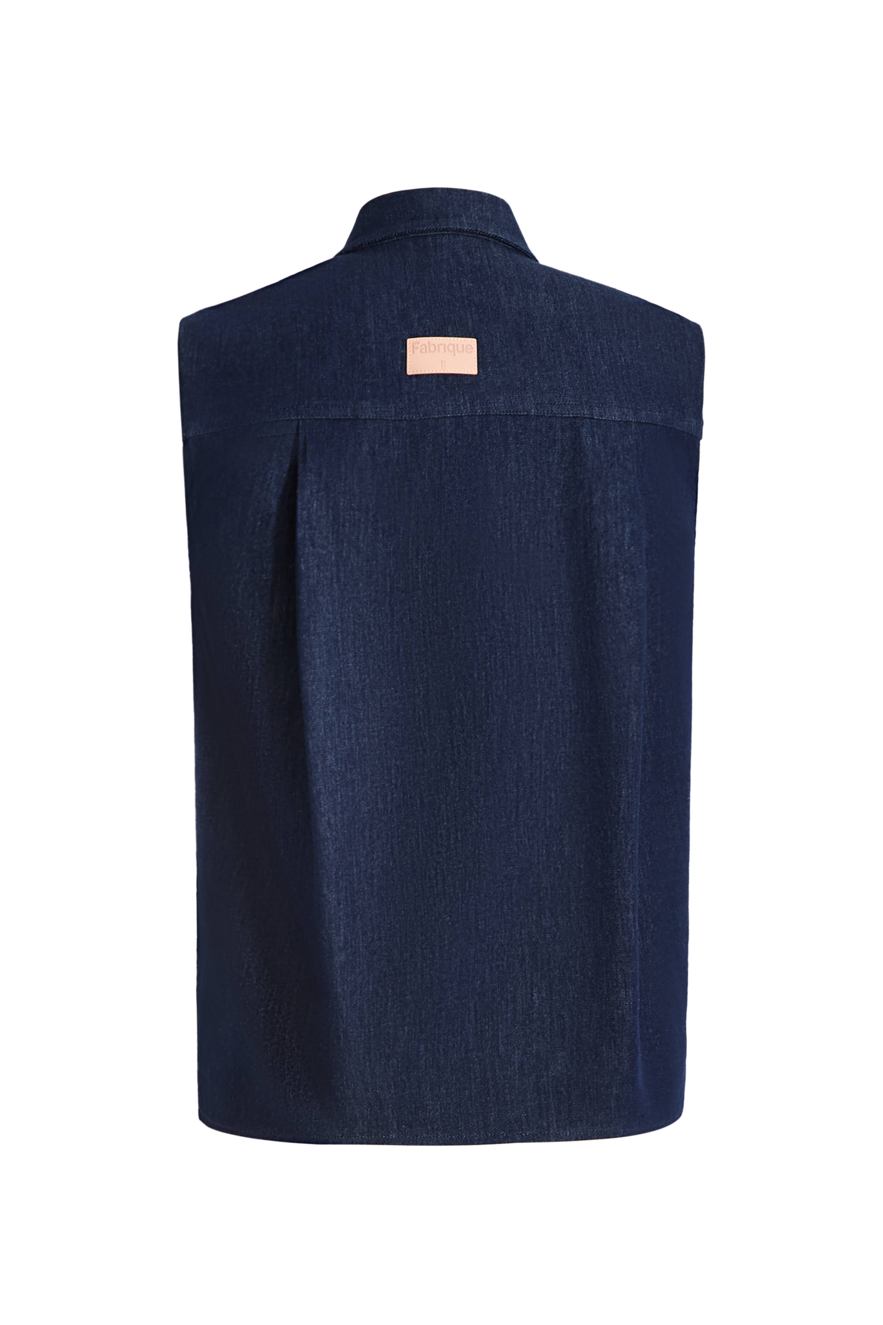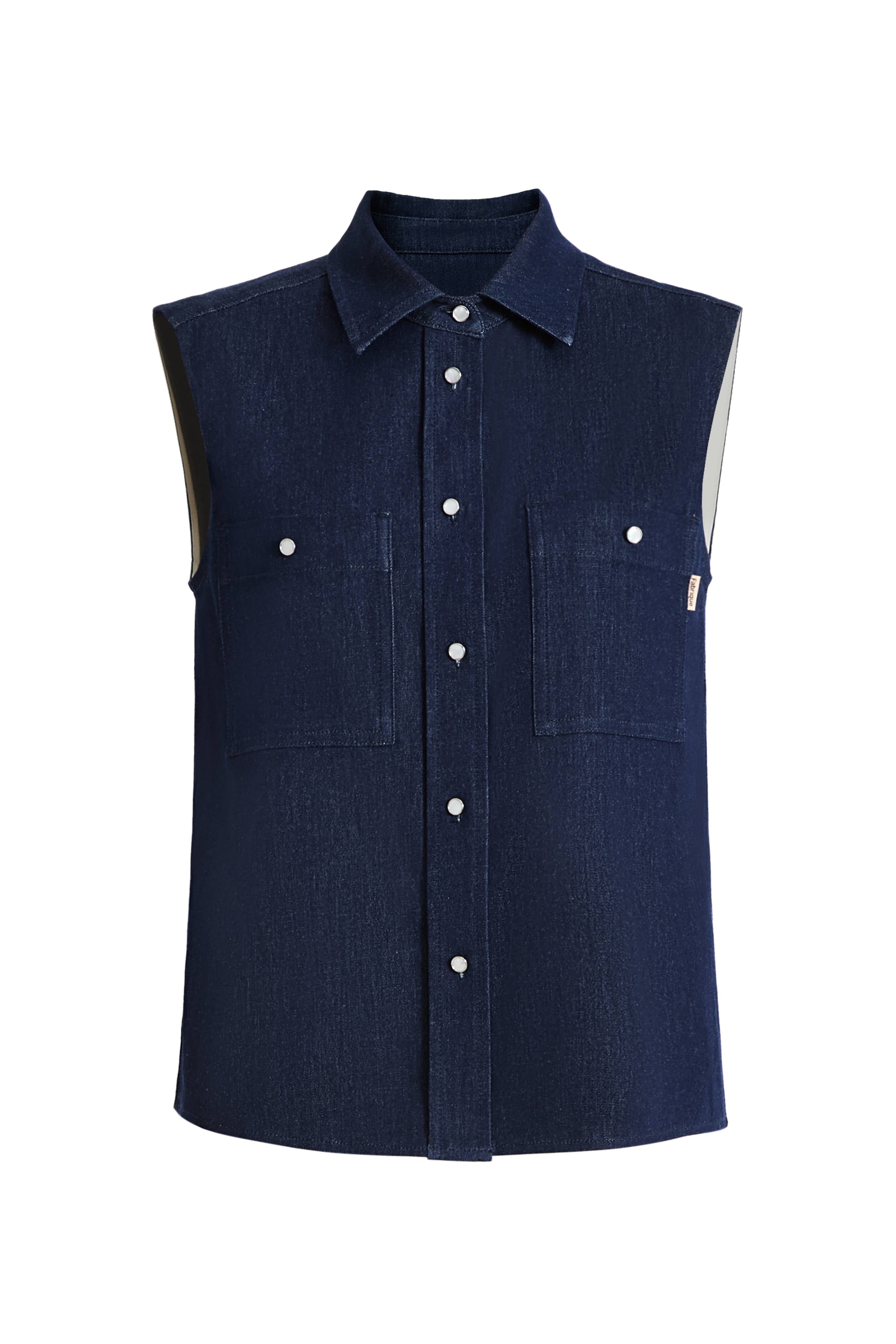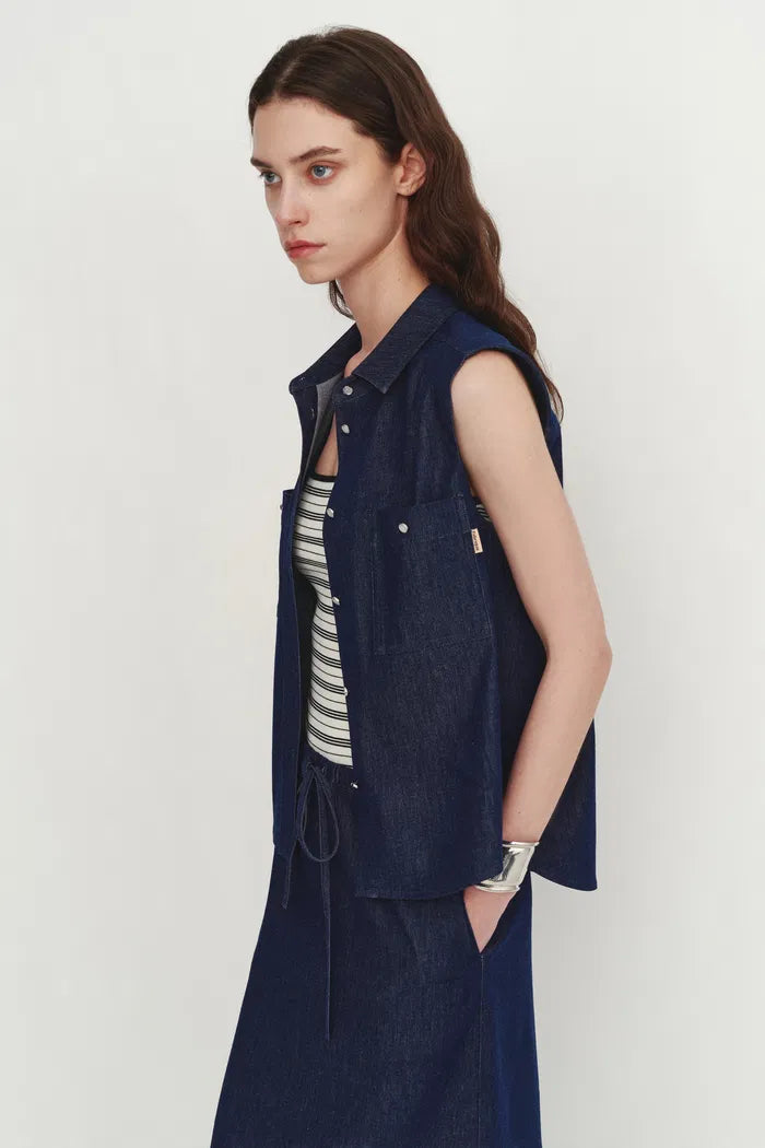 This sleeveless top pairs linen-cotton denim with a sharp pointed collar for the perfect high-low mix. The generous shoulder line creates a flattering frame, while the pearl buttons catch the light beautifully. The stepped hem adds movement to this otherwise structured piece—your new favorite partner to everything from tailored shorts to flowing skirts.