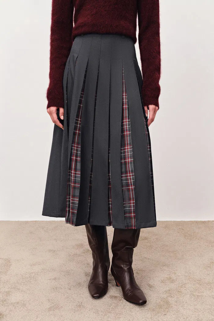 Henrie Pleated Check Maxi Skirt in Fine Wool Blend