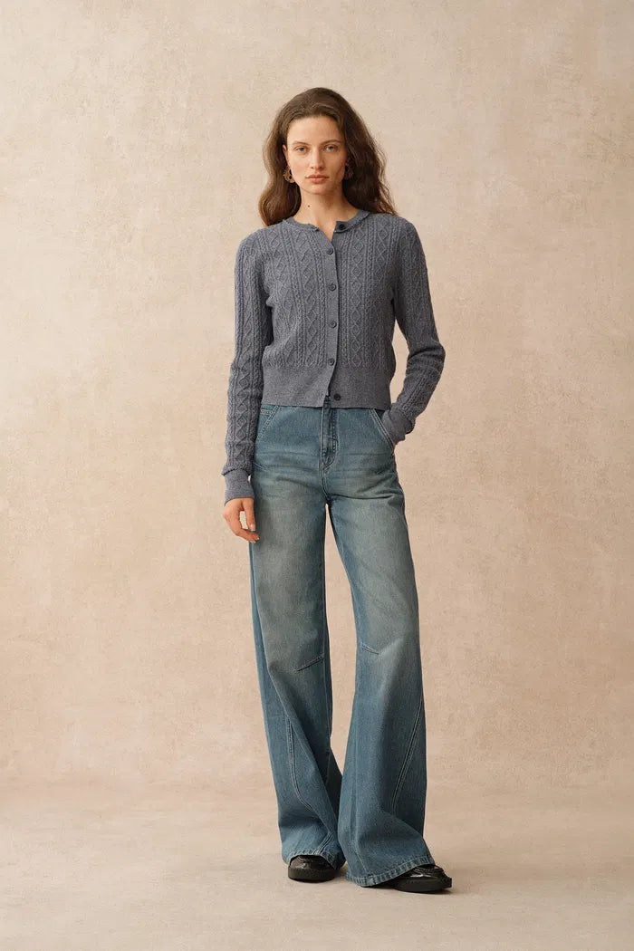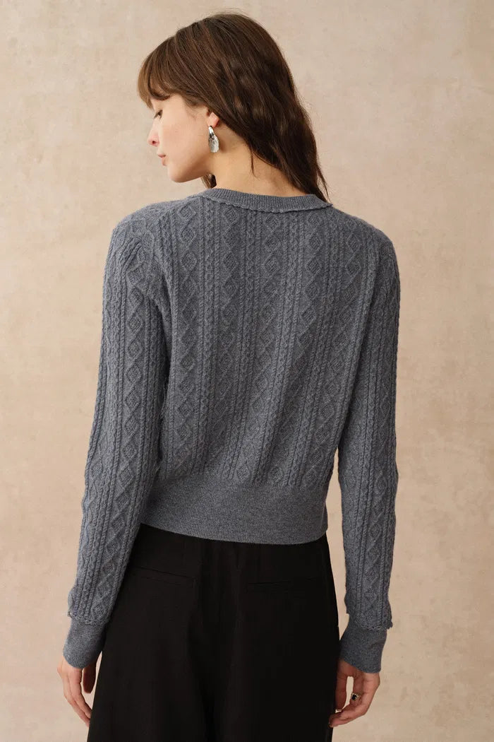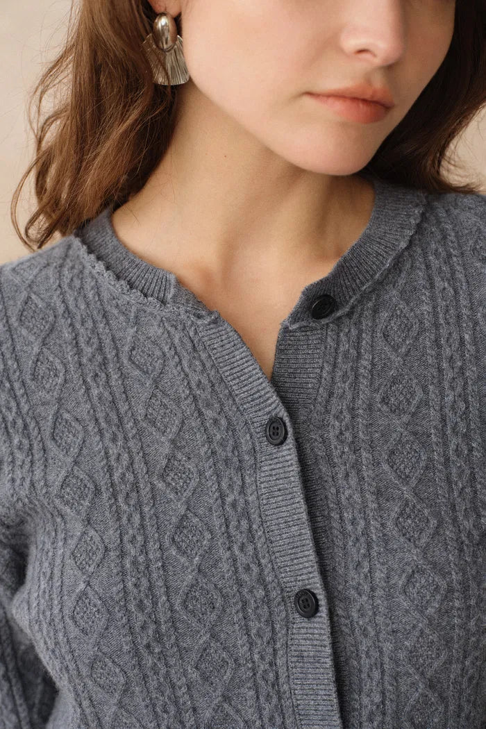 Jinji Grey Lace Trim Light Short Cardigan in Wool Cable Knit