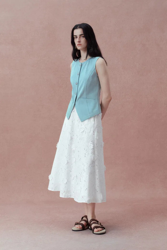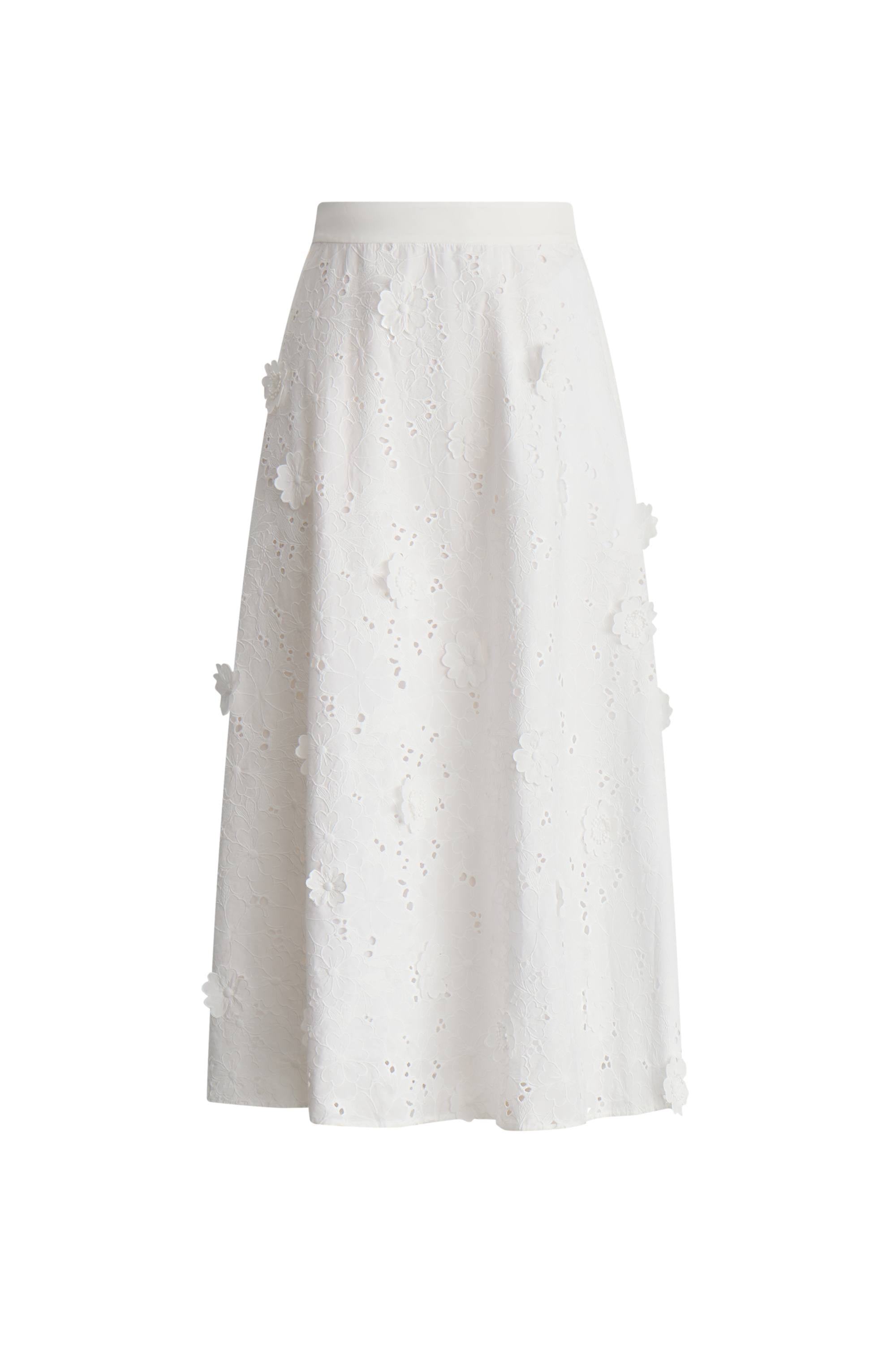 This appliqué skirt brings three-dimensional blooms to life. Each flower is hand-sewn by master craftsmen onto delicate eyelet fabric. The elastic waistband ensures comfort while the full shape creates movement with every step.