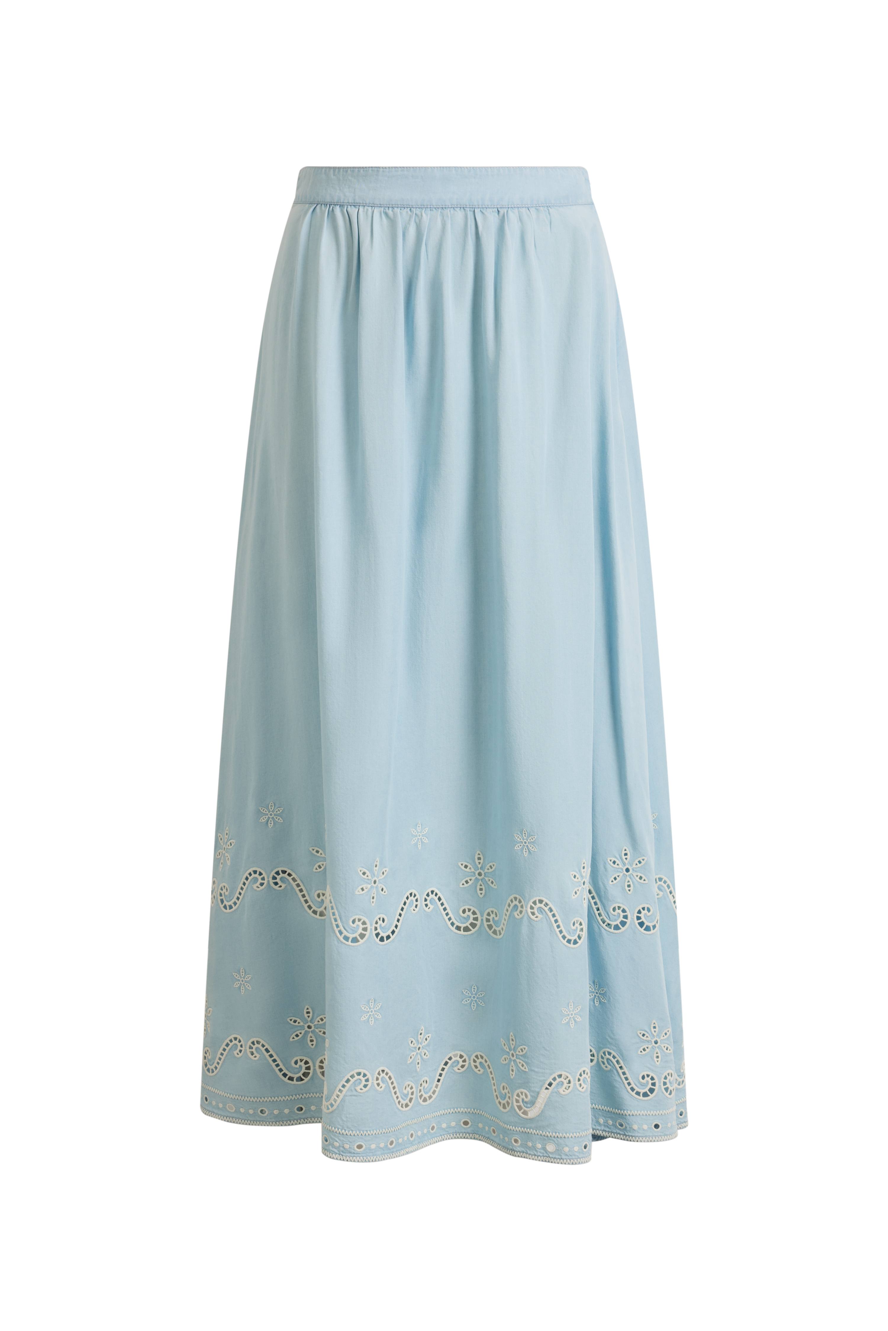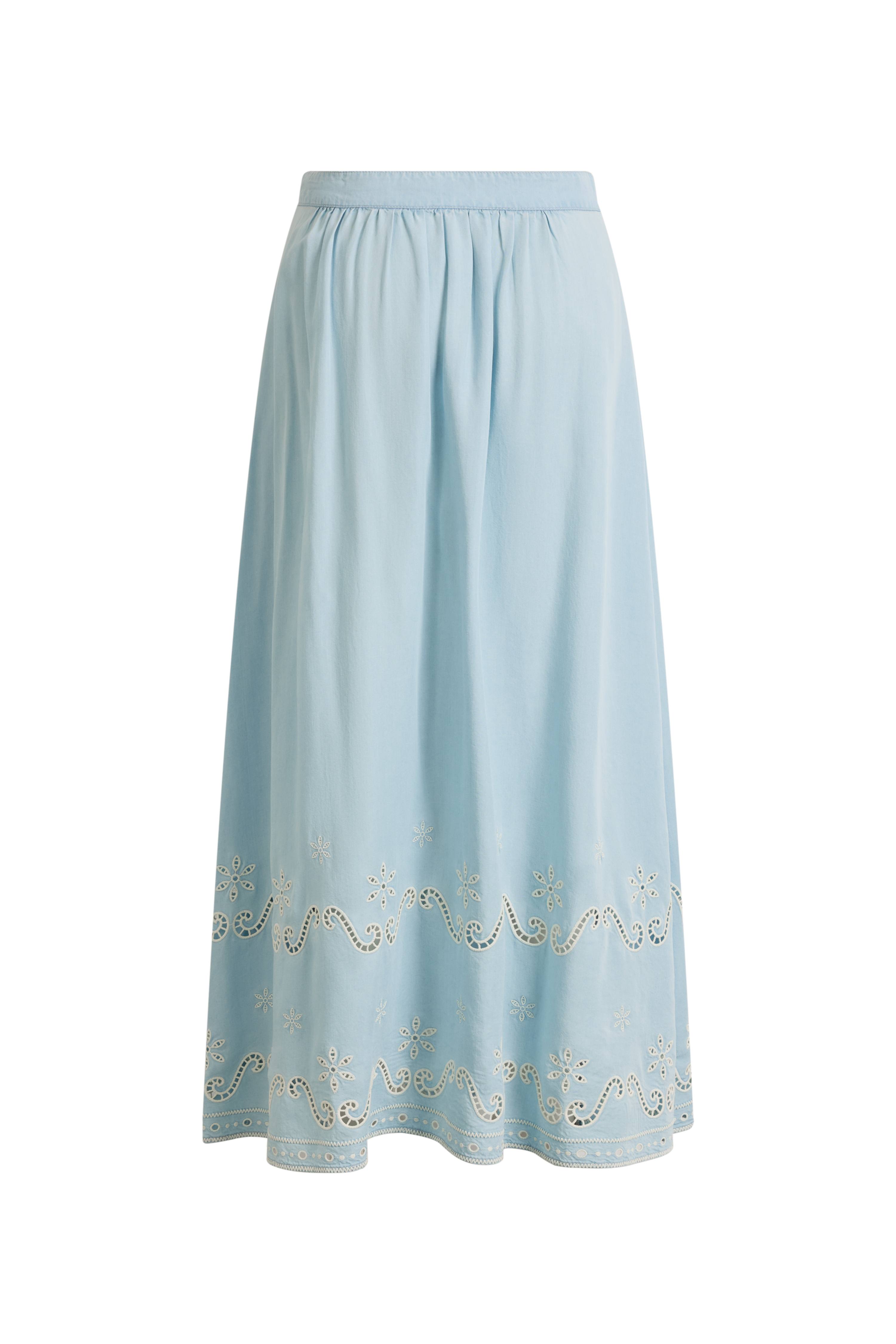 Shirley Eyelet Embroidered Washed Light-Blue Denim Skirt in Tencel Denim