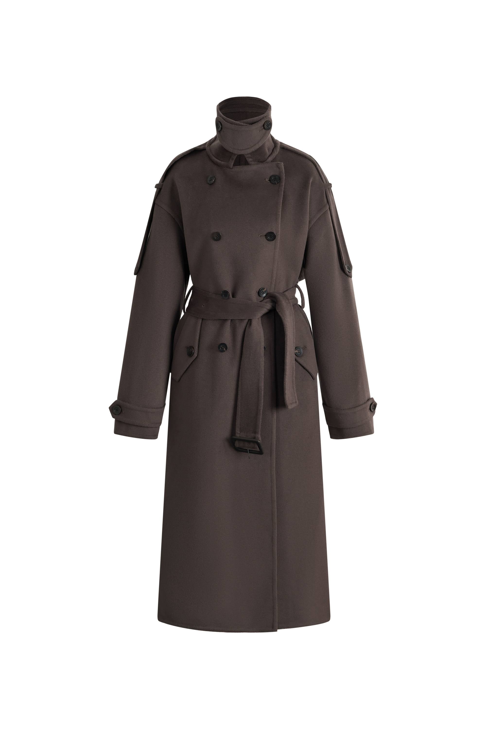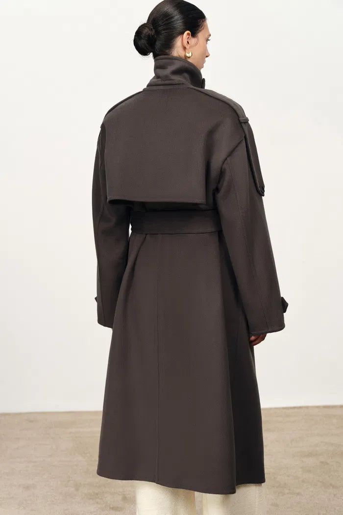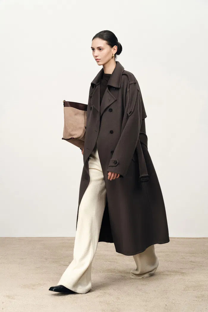 Double-faced wool softens the structure of a trench into an everyday long coat. Extended shoulder tabs and a wide collar give relaxed balance, finished with a belt for quiet definition.