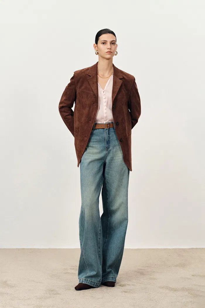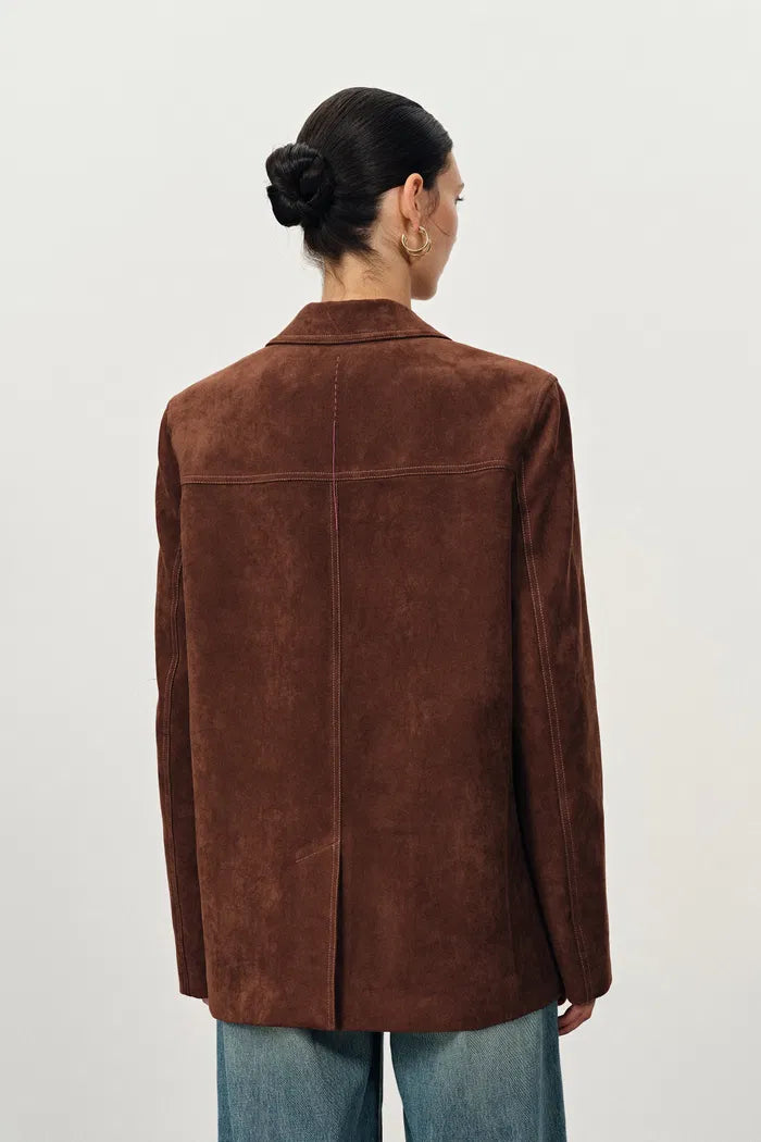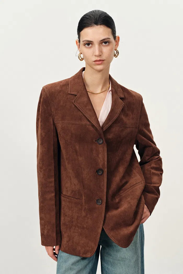 Verdi Curved Hem Loose Suit Blazer in Faux Suede