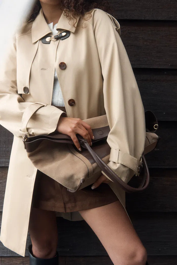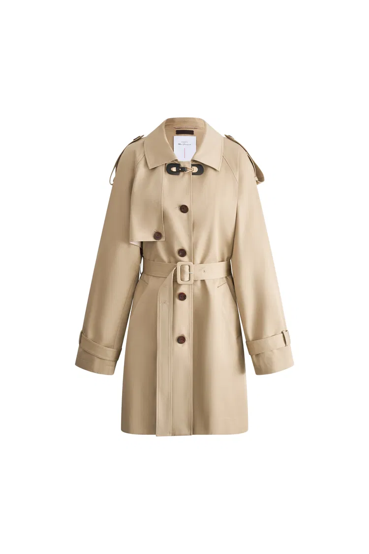 Black-gold hardware adds luxury detailing to this single-breasted trench. Adjustable sleeve tabs provide wind protection while architectural seaming creates structured interest. Light yellow feels more energetic than traditional khaki.