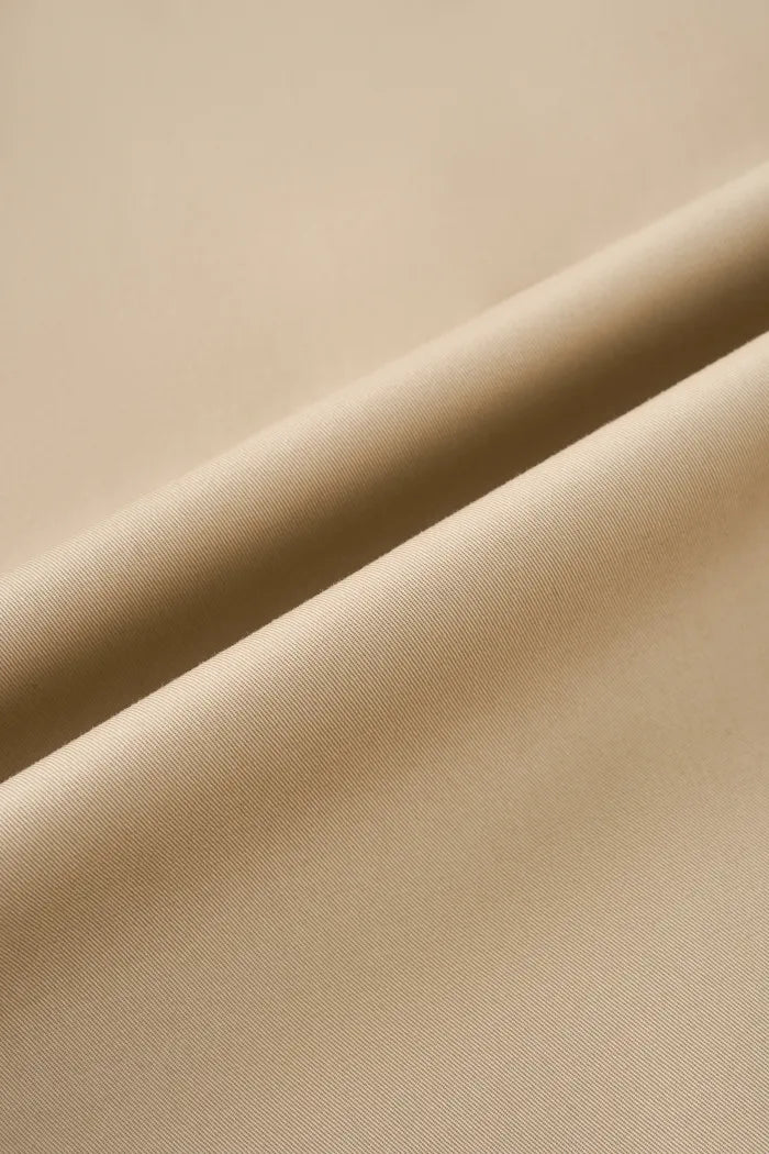 Lightweight pure cotton trench fabric with smooth surface. Light yet structured - wrinkle-resistant for easy care. Low-saturation pale yellow is brighter than traditional khaki with elegant vitality. Easy daily care for lasting refinement. Light, elegant, easy-care.
