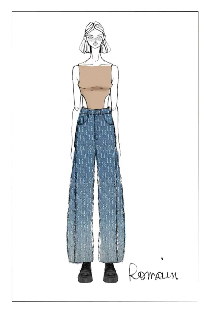- Curved wide-leg silhouette