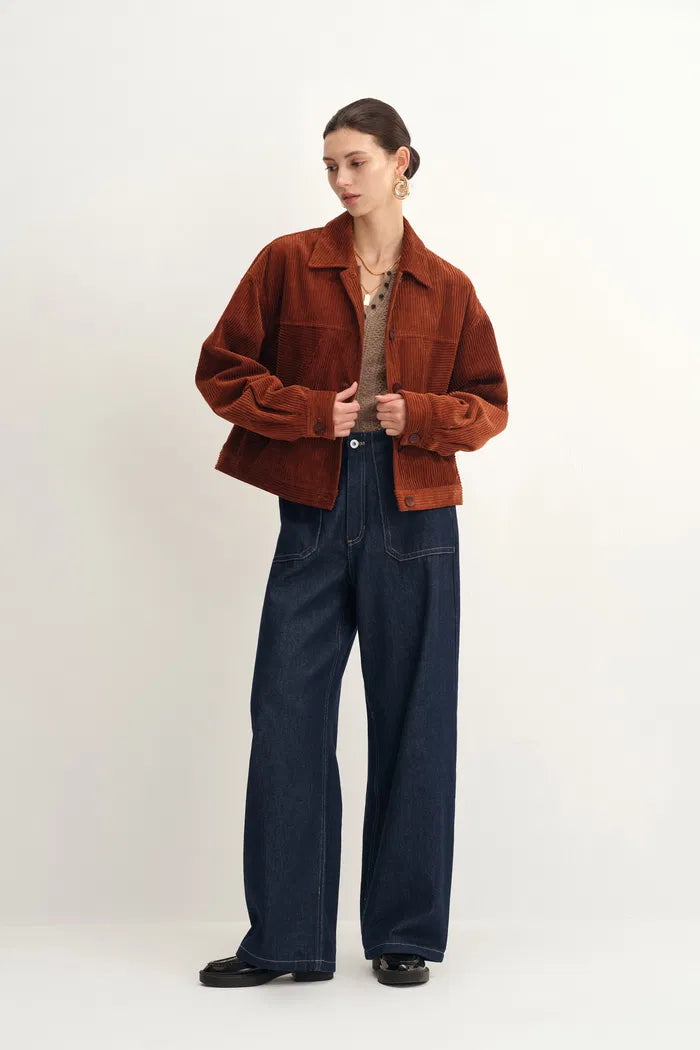 Oversized pockets add utilitarian appeal without overwhelming proportions.
