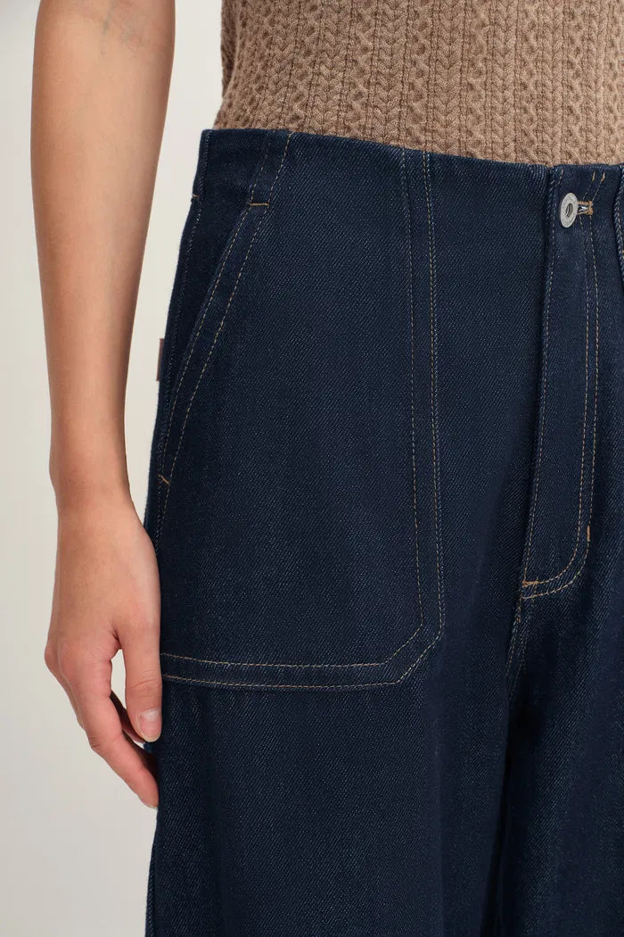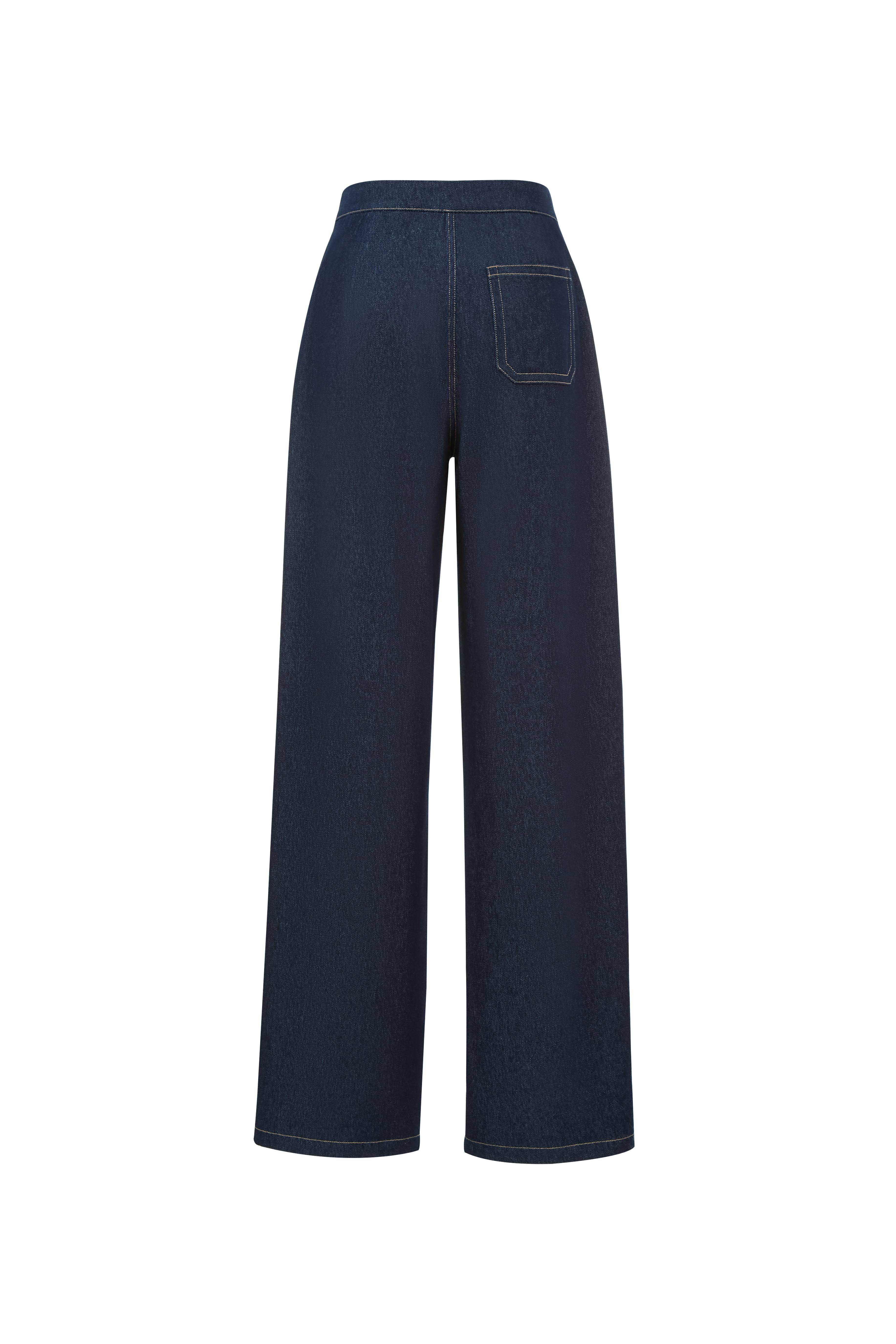These wide-leg trousers feature the connected waistband construction you see in innovative tailoring. Contrast topstitching and oversized pockets create the workwear details found in authentic design. Tencel-denim blend provides the comfortable drape you expect from quality fabrics.