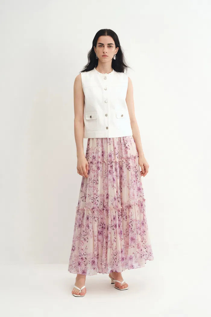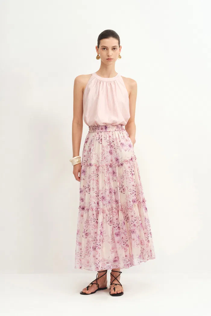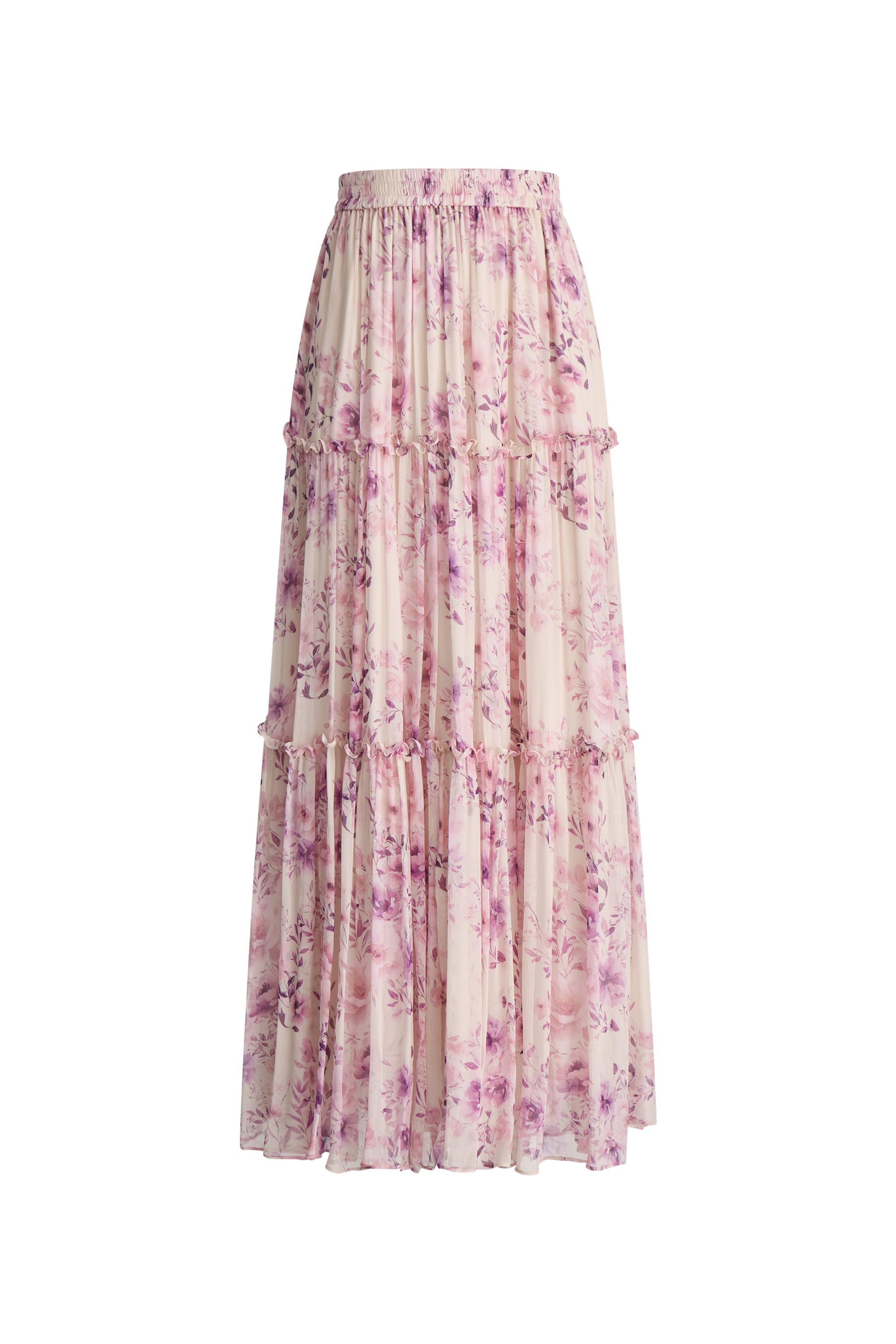 This Mia maxi introduces drama with a full umbrella silhouette. Ruffle details create movement along the seams, while the elastic waistband ensures comfort regardless of fluctuations. Crafted from airy fabric with hand-painted florals, it brings peachy garden-party vibes to any outfit.