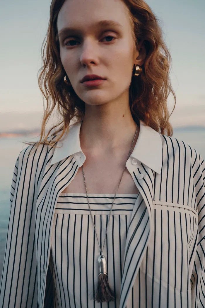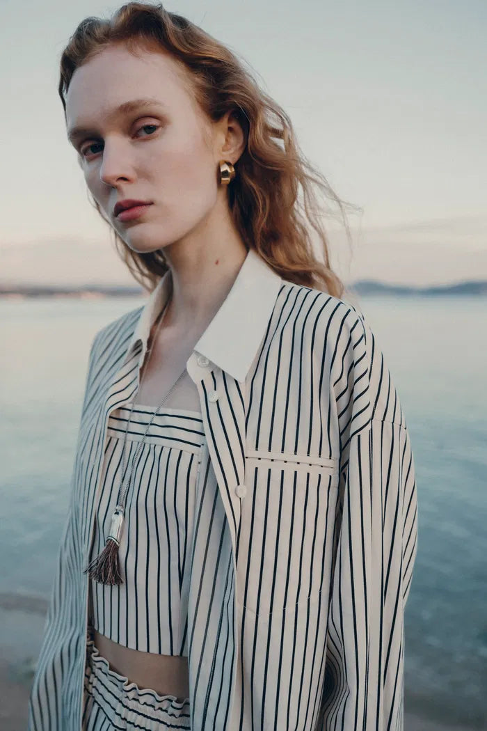A refined take on stripes. The pointed collar and crisp contrast trim make this striped shirt a modern staple. A hidden button placket and curved hem keep it clean, balancing structure with fluidity. These aren’t just striped shorts—they’re a warm-weather go-to. A mid-rise cut with subtle ruffle trim at the waist adds polish, while side pockets and a relaxed A-line shape keep things comfortable.