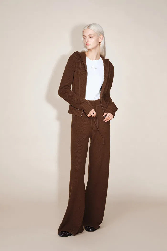 A modern hooded cardigan with a double-zip front for flexible styling. Raglan sleeves enhance the relaxed silhouette, while the pure wool yarn in a cinnamon shade brings softness and natural depth to everyday layering.
