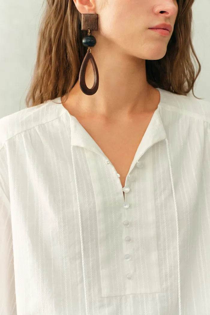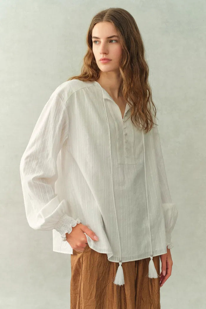 A moonlight-white jacquard stripe shirt where texture replaces print. The beaded fringe tie adds a small focal point, while the sleeves keep the silhouette light and modern.