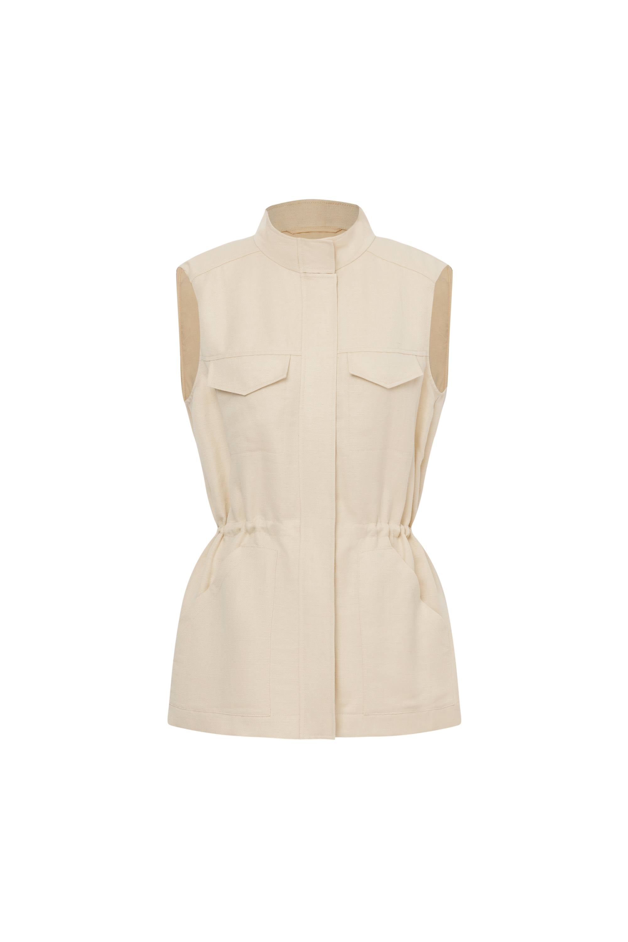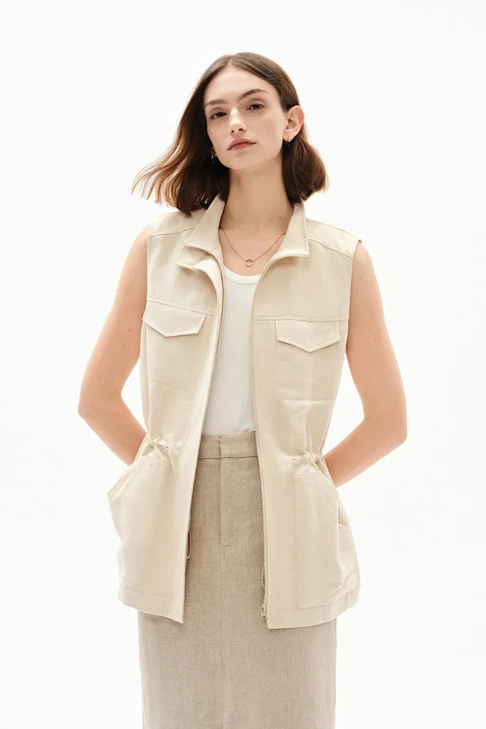 Your new favorite layering piece has arrived. This vest combines safari charm with silk-linen ease. Hidden drawstring shapes while tonal zips keep things sleek – utility details that know how to behave.