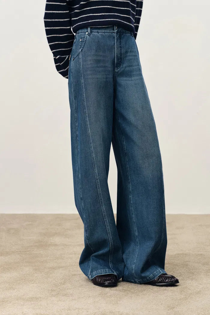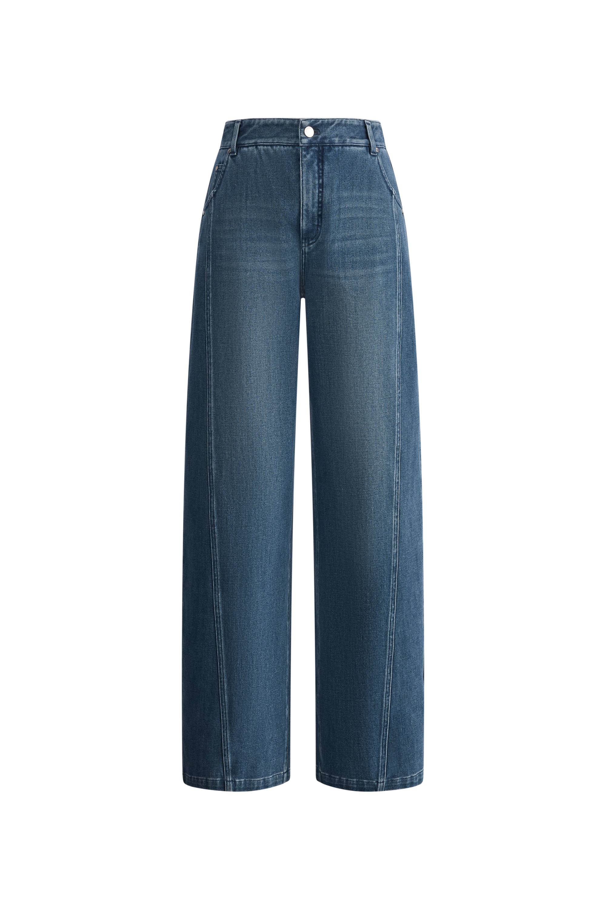 Side panels create visual slimming through strategic construction. Soft denim feels comfortable all day, and the barrel-leg silhouette offers relaxed sophistication with authentic vintage character.