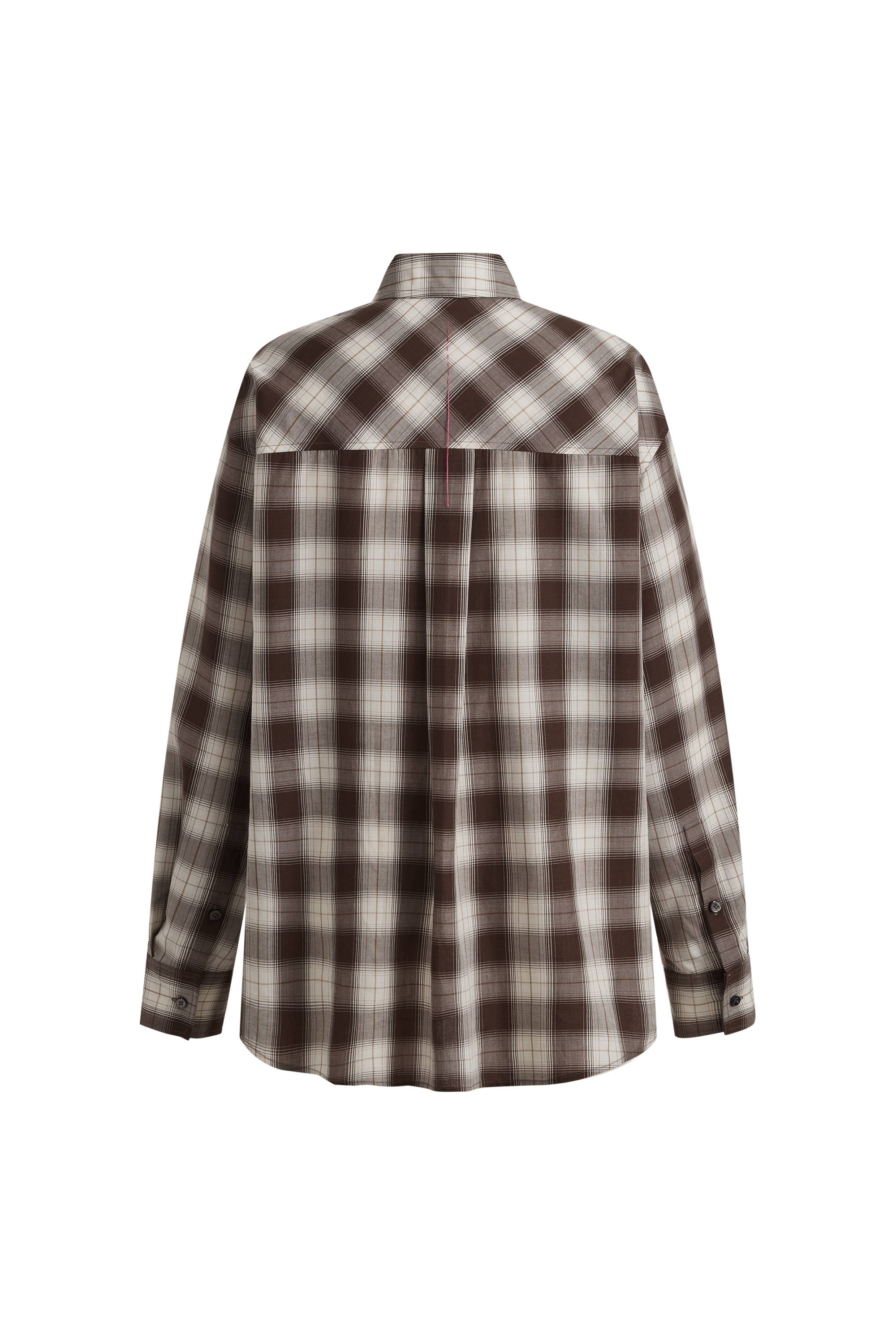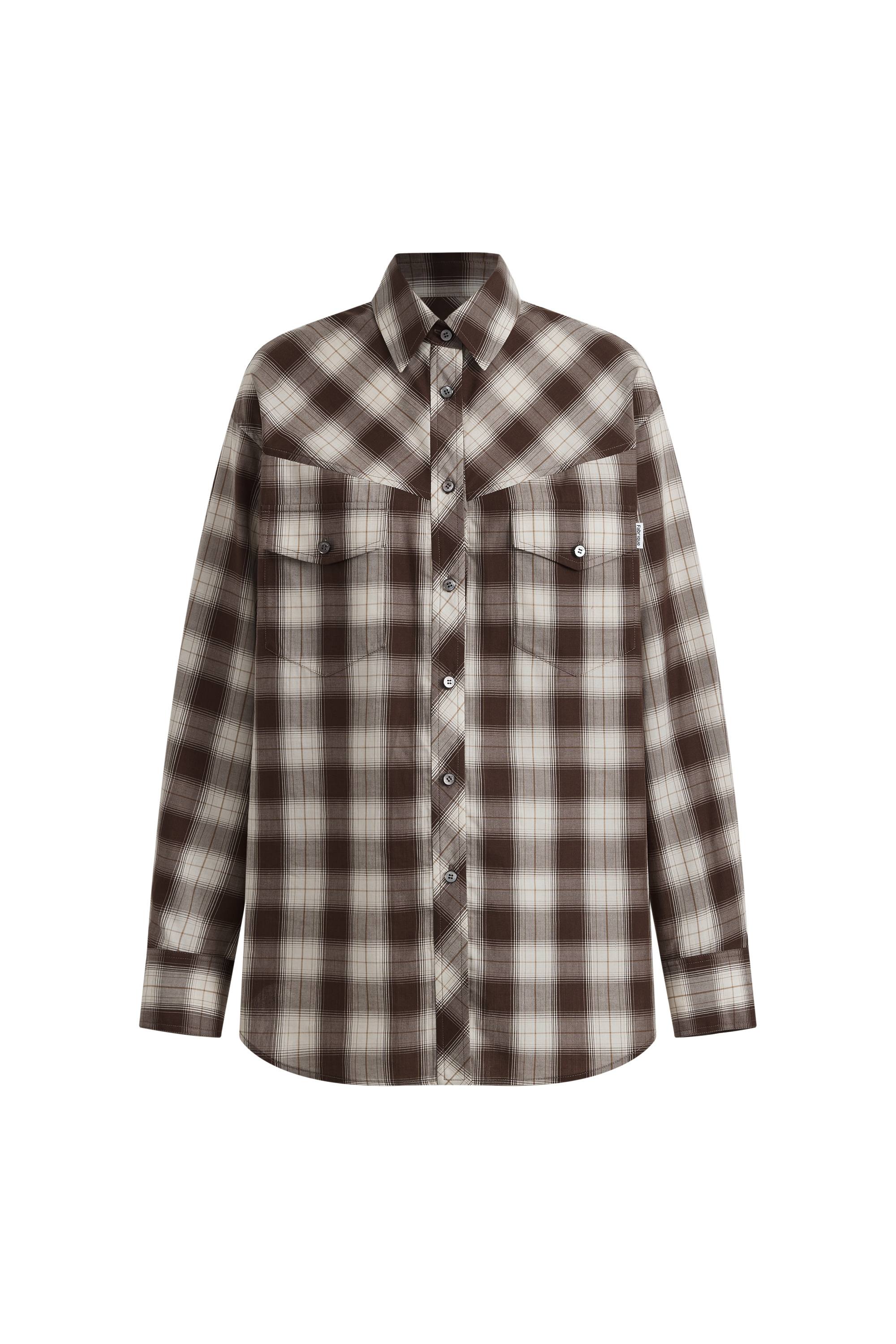 An ebony-brown plaid shirt in a soft Tencel wool blend that drapes rather than sits stiff. The wrap-style placket lets you wear it straight or buttoned to the side for a more defined waist.