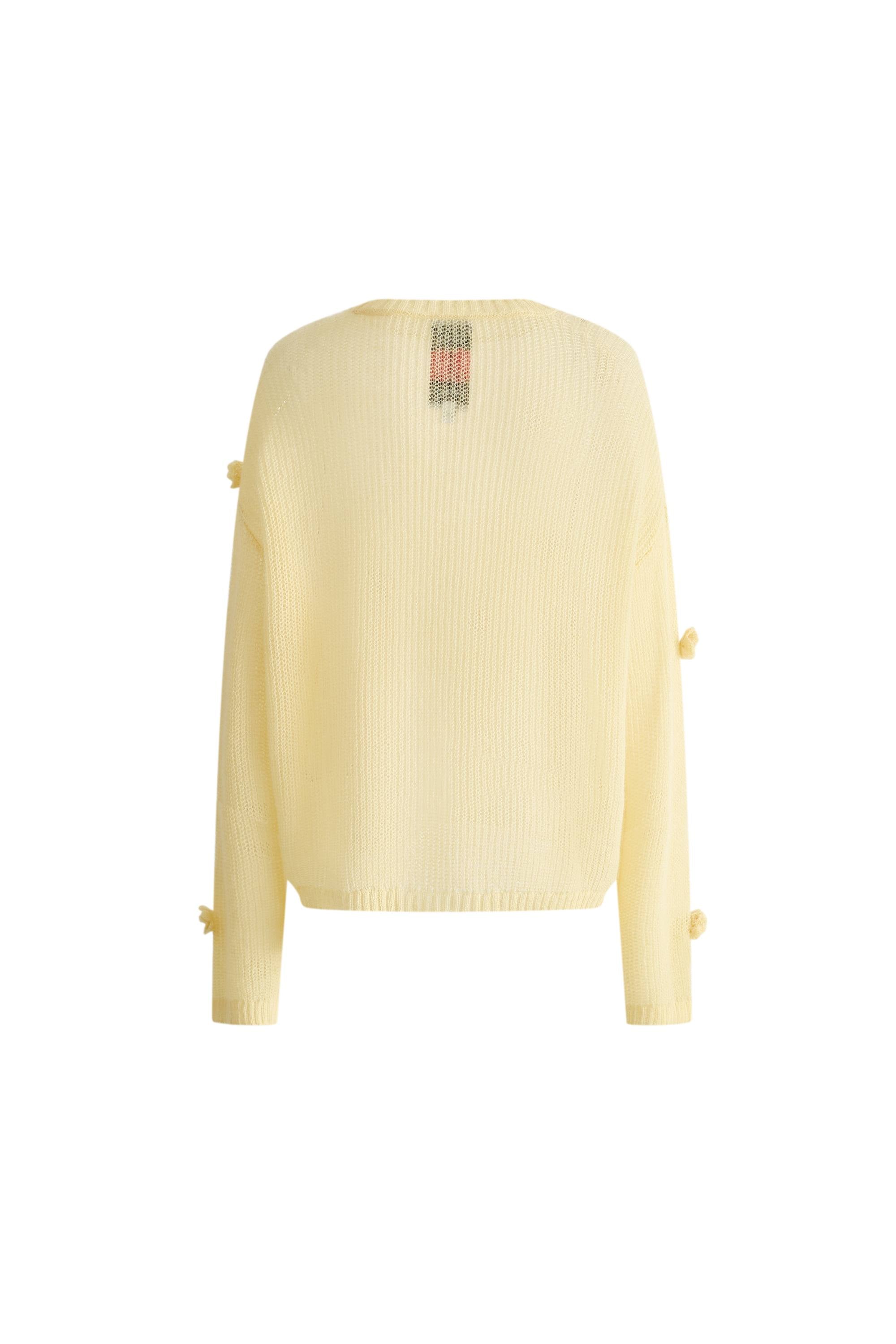 A relaxed ribbed neckline frames hand-crocheted camellia flowers with dyed bead centers, while mohair yarn creates that cloud-like softness you feel in quality knitwear, perfect for layering for cooler days.