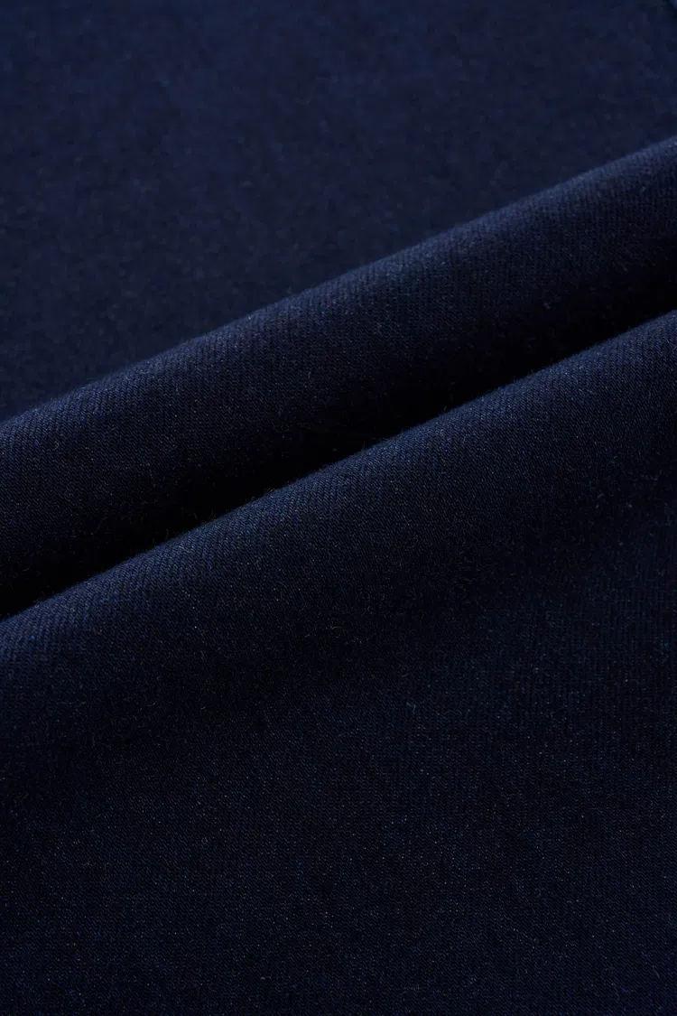 Wool blend denim water-softened with fleece lining for skin-friendly zero-friction comfort. Combines rugged denim style with winter warmth practicality.