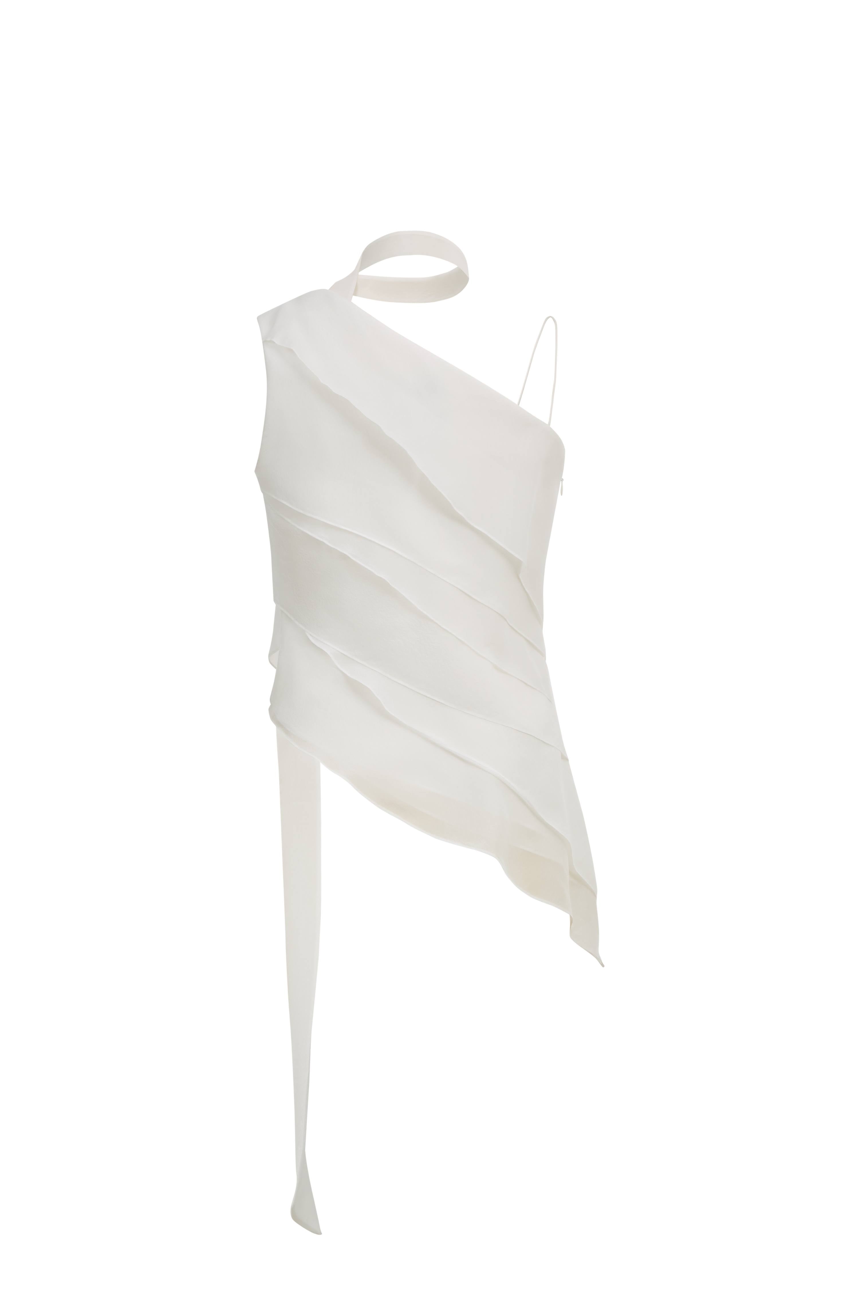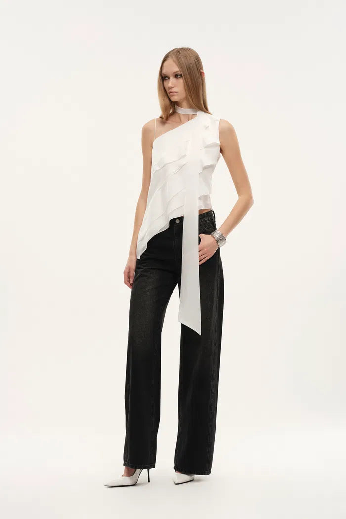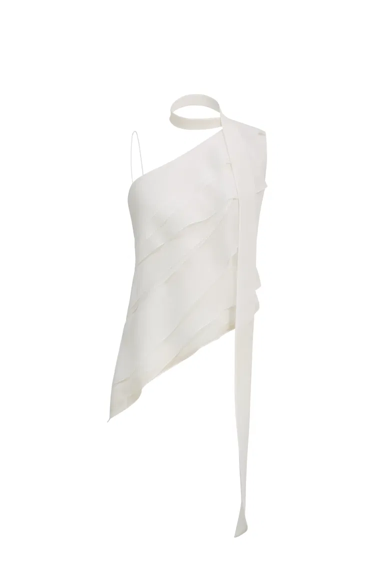 A sheer ruffled top that borrows from bridal codes but refuses to stay formal. The layered construction, asymmetric lines, and trailing ties give it a sense of movement that feels both romantic and slightly undone.