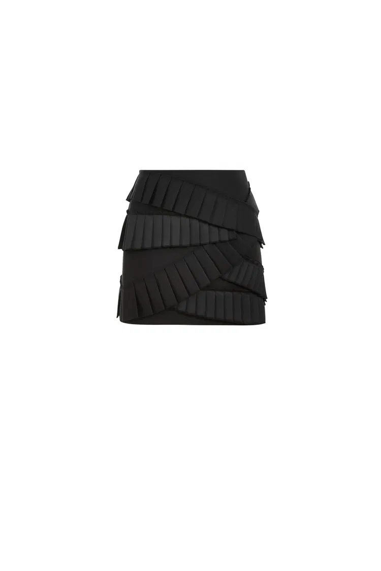 Mulberry silk and acetic acid blended tulle offers an elegant, light, silky-smooth hand with a subtle gloss. Oblique cutting creates fluid lines and contours, translating haute couture elements into high-fashion design.
