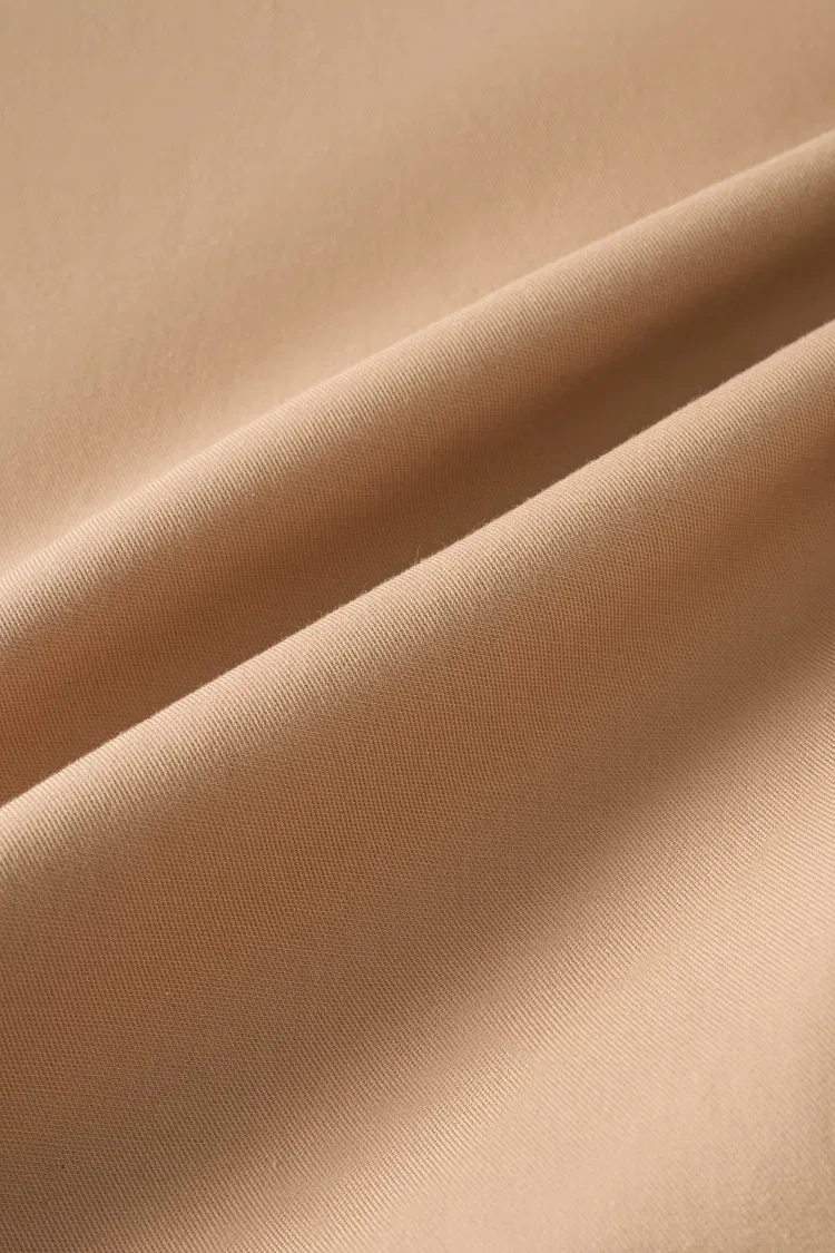 100% cotton fine twill trench fabric from combed cotton with high-count, dense texture. Smooth surface that's wrinkle-resistant for easy care. Smooth cotton plaid lining complements vintage pattern and classic khaki for autumn inspiration. Smooth, easy-care, vintage.