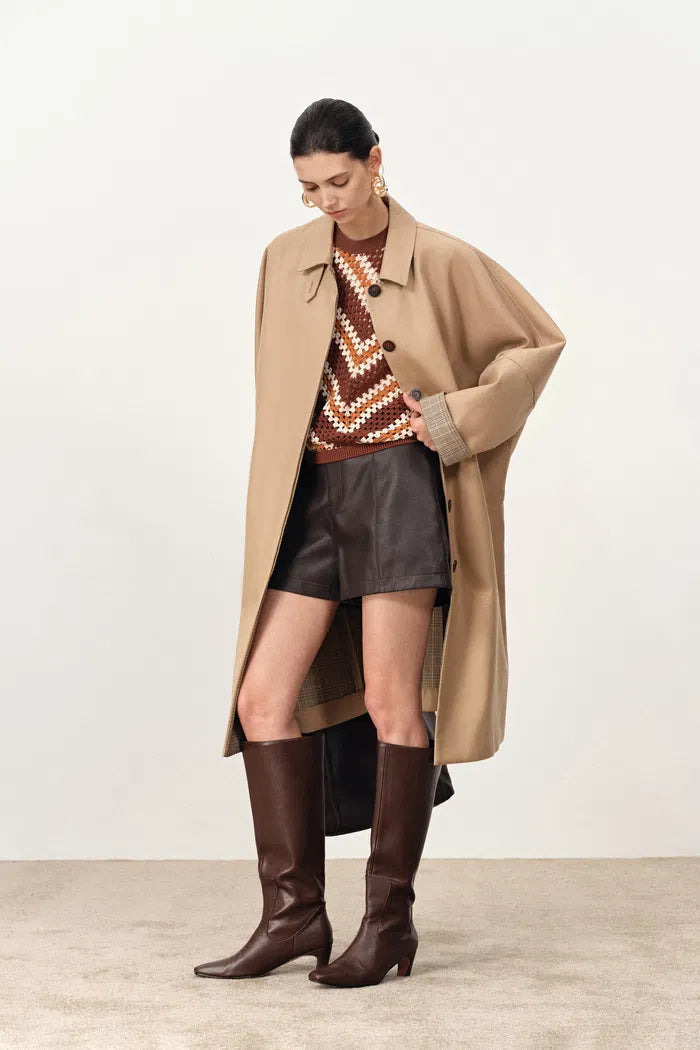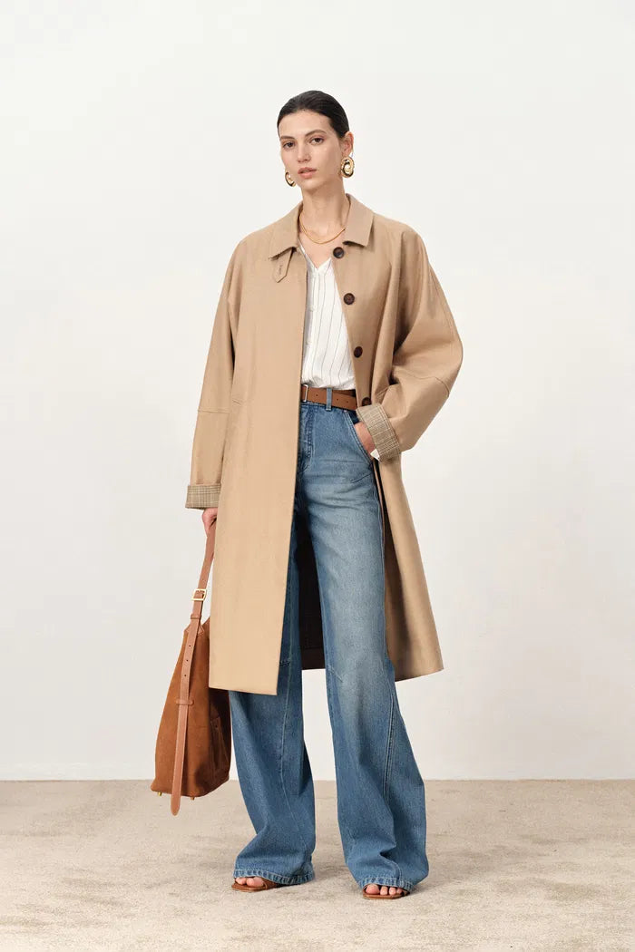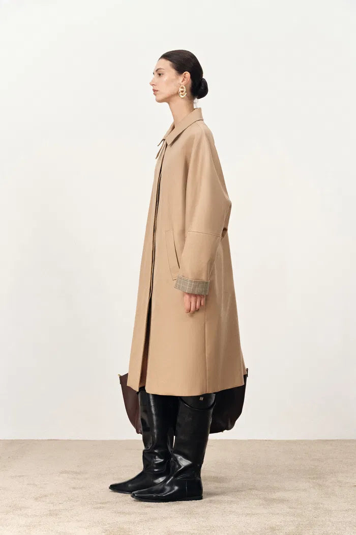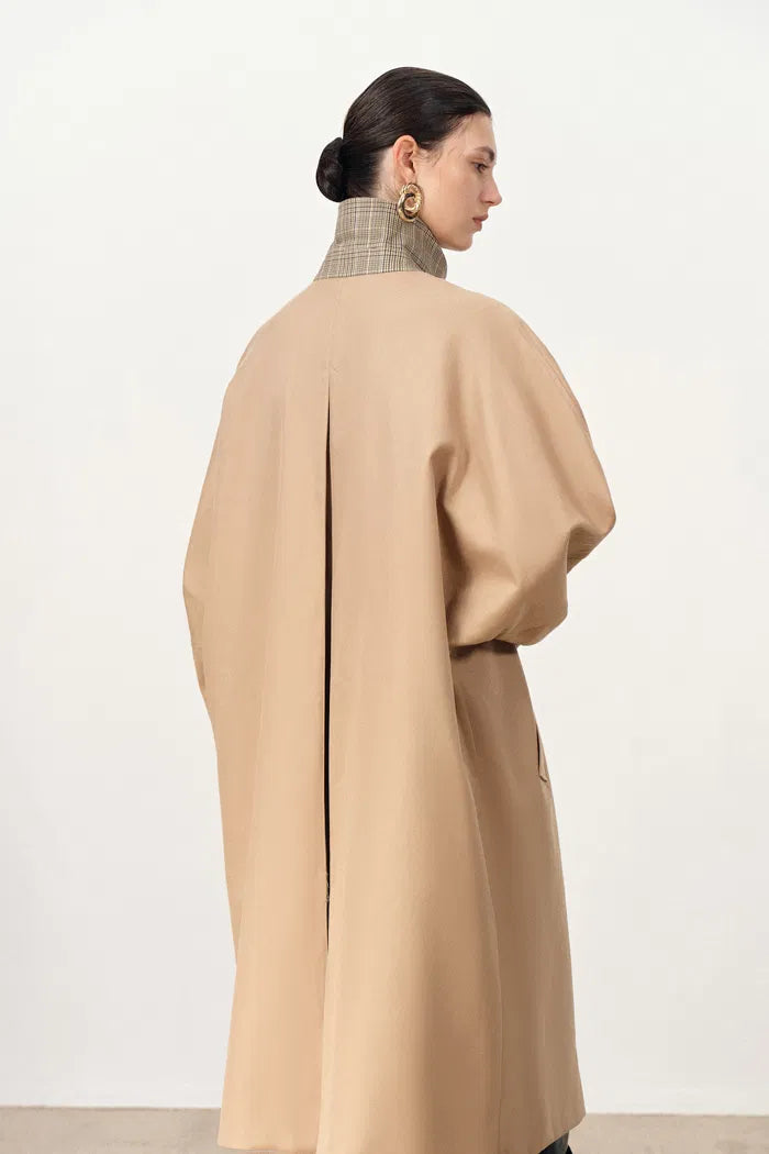 Batwing sleeves create architectural drama in this Nordic-inspired trench. Single-breasted closure maintains minimalistic elegance while the tiny collar contrasts beautifully with oversized proportions. Plaid lining adds heritage appeal to the contemporary silhouette.