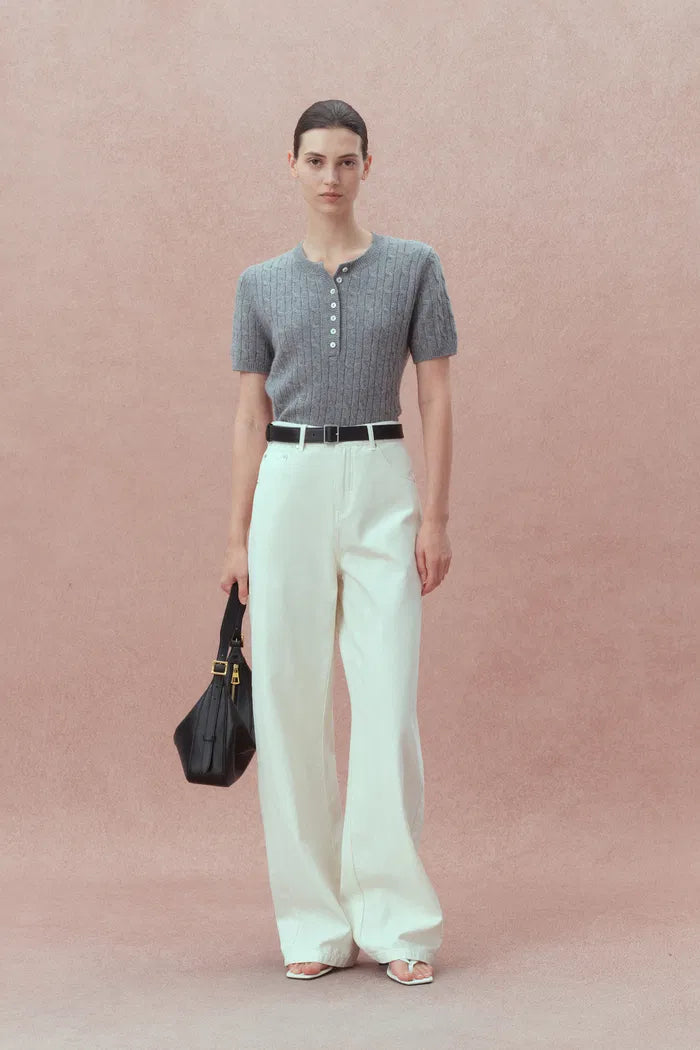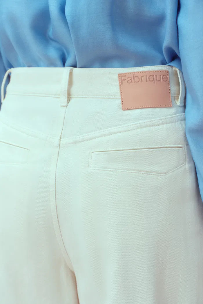 Estos jeans Akari llevan líneas arquitectónicas al denim blanco mediante costuras curvas sutiles. La pierna barrel crea un volumen a la moda mientras que el tejido espiga añade una textura sutil. La cintura natural favorece todas las figuras manteniendo estructura y comodidad.