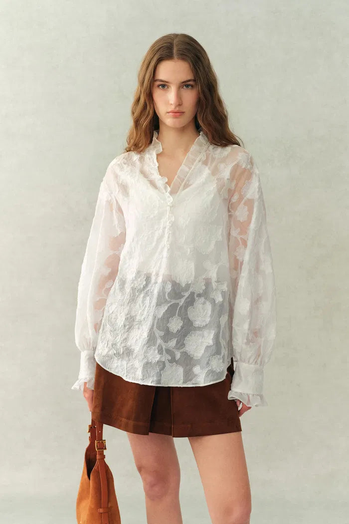 Blusa Cecilia con volantes y cuello en V en chiffon burnout