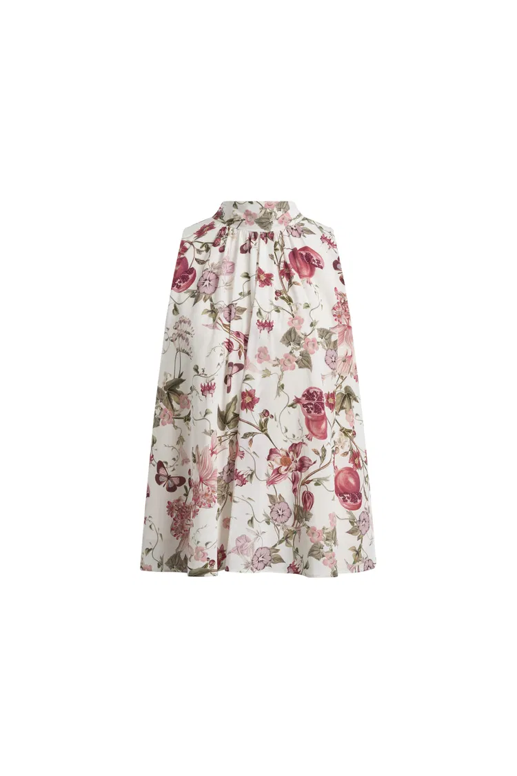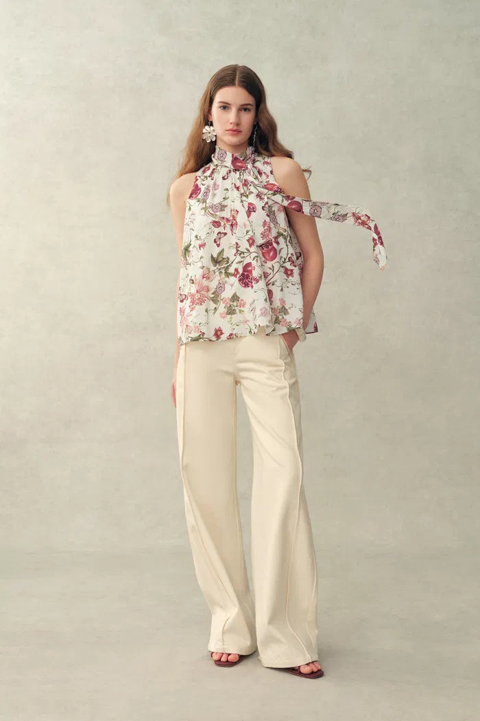 Una bonita actualización del top de verano sin mangas, esta pieza utiliza un suave estampado floral de granada, un escote halter elevado y un dobladillo peplum fluido para crear forma. La tela rica en seda lo mantiene ligero y fluido, haciéndolo especialmente bueno con pantalones limpios o una falda sencilla.