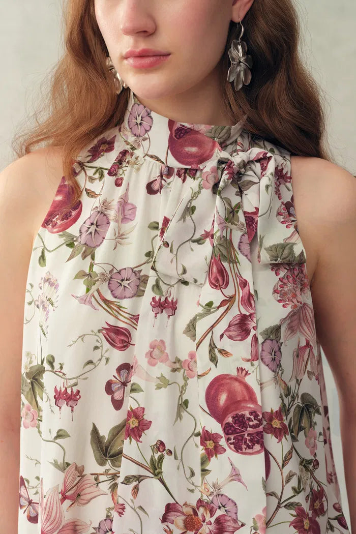 Blusa Pernilla con Estampado Floral de Granada y Lazo en Cuello, en Crepé Doble de Seda Elástica